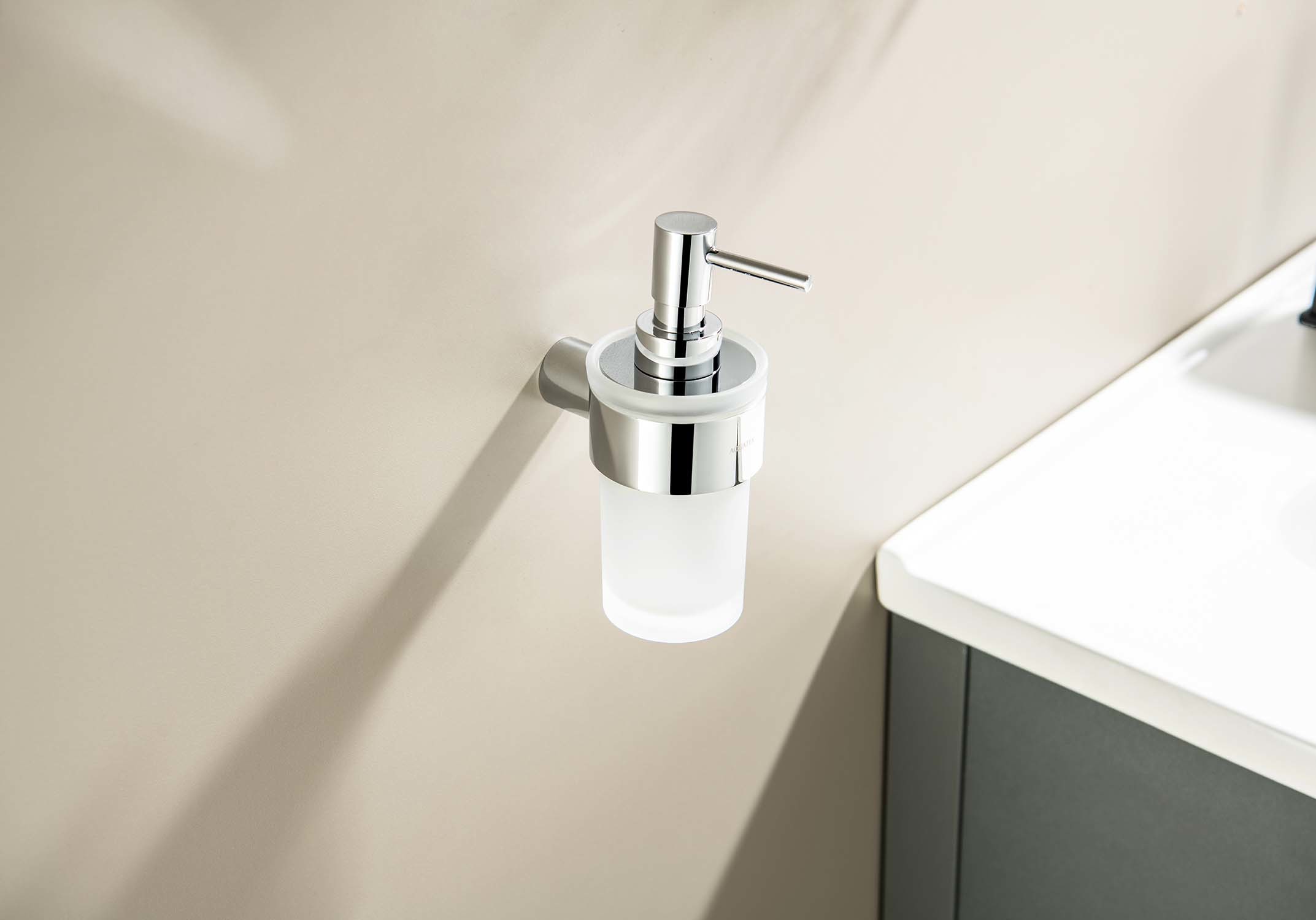 Дозатор для жидкого мыла Aquatek Лира AQ4405CR с настенным держателем, материал латунь/нержавеющая сталь/стекло, цвет хром.