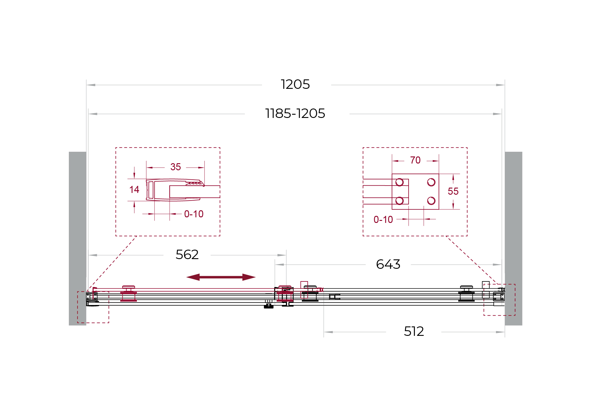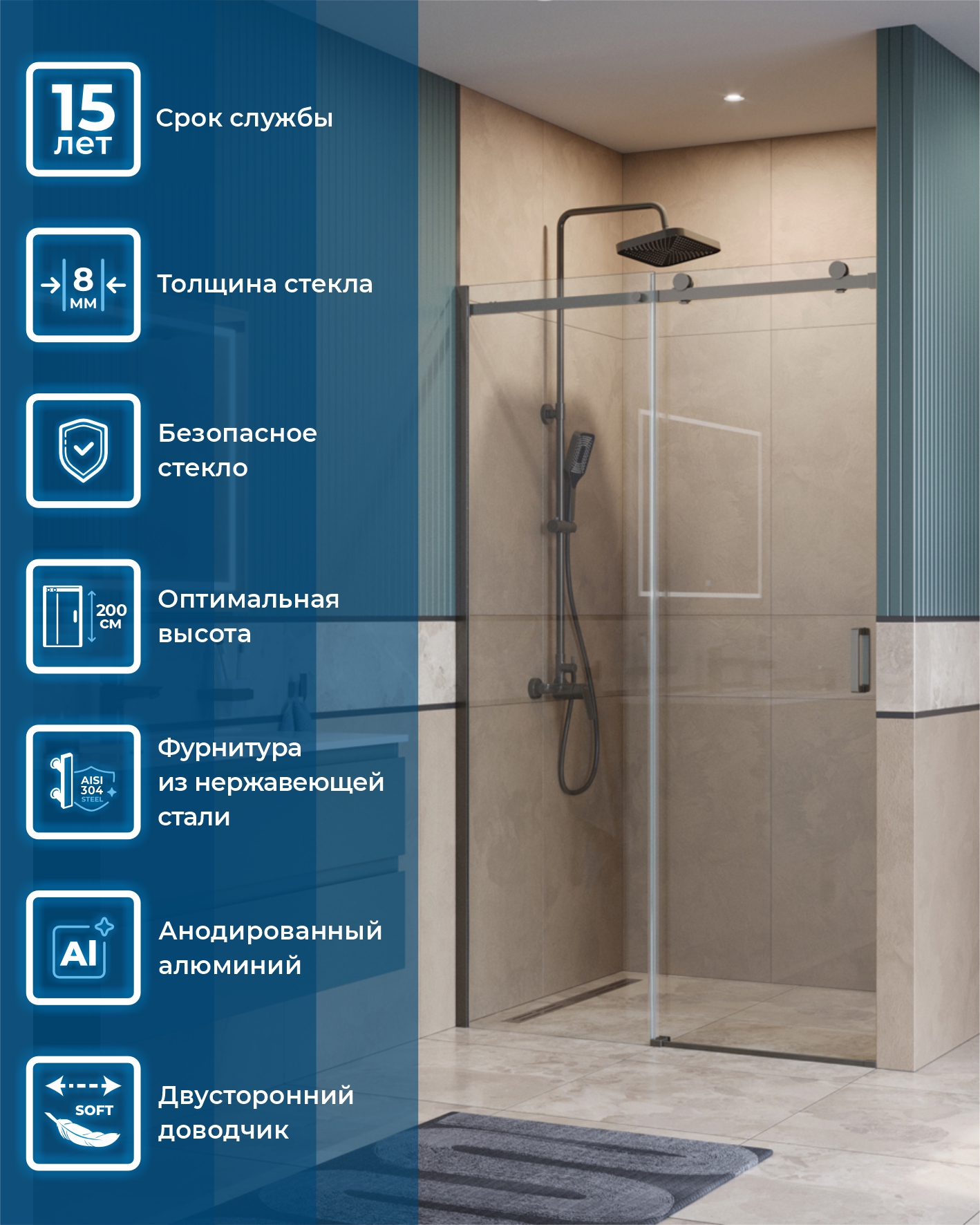 - Надёжная фурнитура: раздвижная конструкция на роликах увеличенного диаметра из нержавеющей стали.