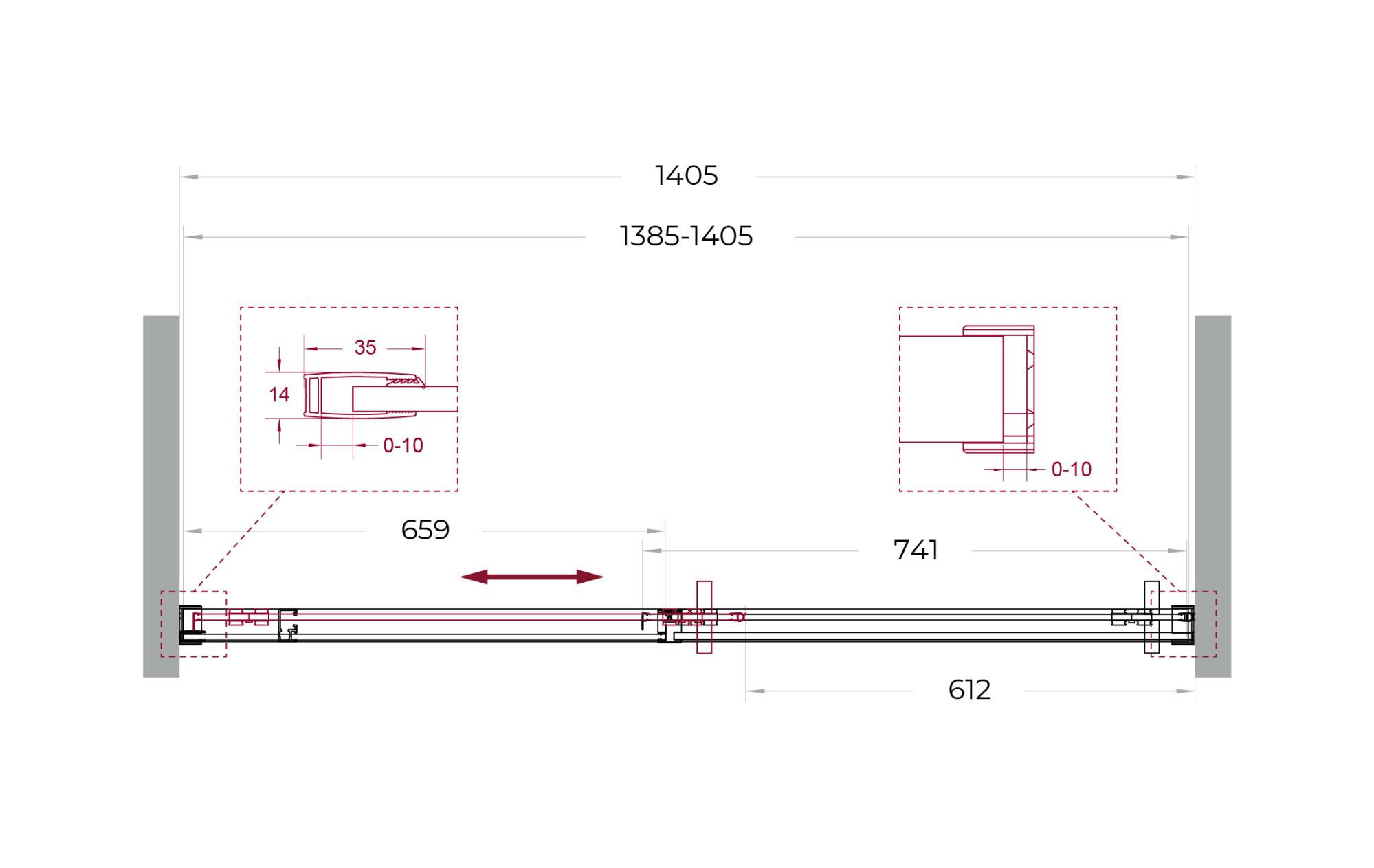 - Система подвески: Двойные навесные ролики из нержавеющей стали с держателем стекла обеспечивают плавное движение створки, ее устойчивость и отсутствие перекосов.