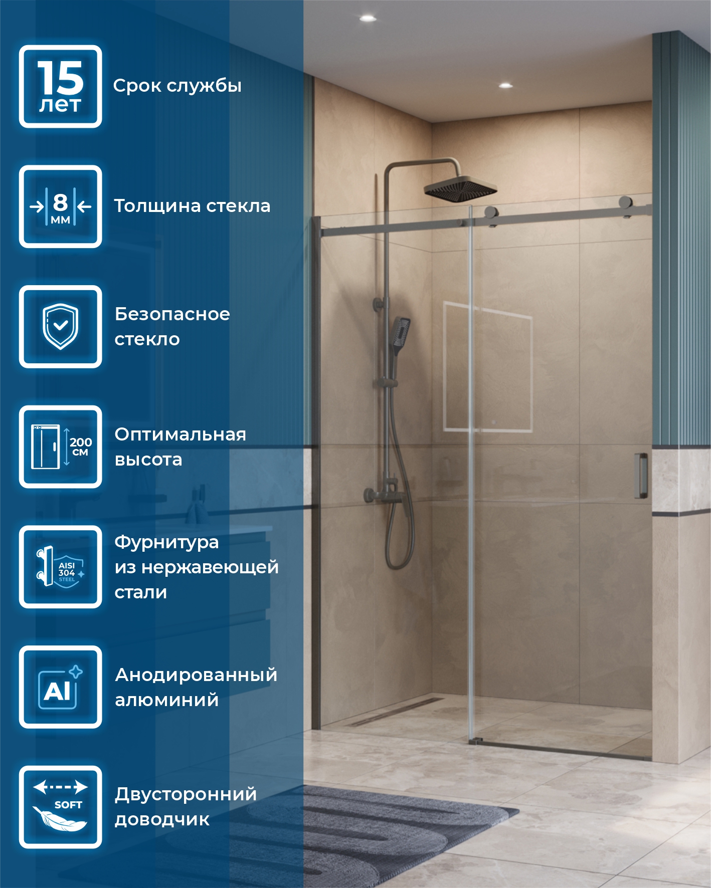 - Надёжная фурнитура: раздвижная конструкция на роликах увеличенного диаметра из нержавеющей стали.