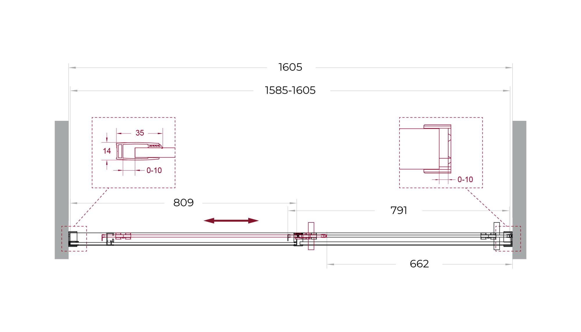 - Система подвески: Двойные навесные ролики из нержавеющей стали с держателем стекла обеспечивают плавное движение створки, ее устойчивость и отсутствие перекосов.