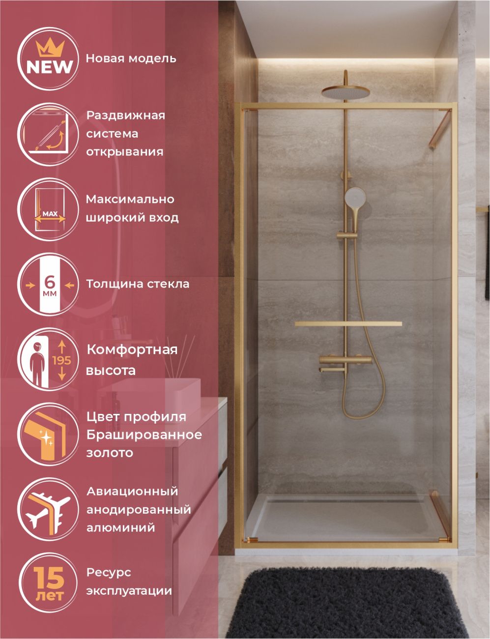 Душевая дверь Cezares Lux 100 см LUX-B-FS-1-100-C-BORO, брашированное золото/прозрачное