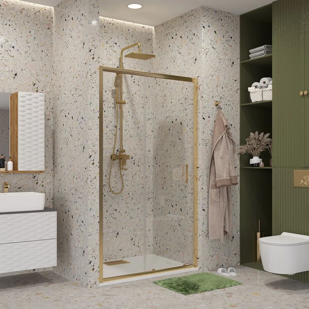 Душевая дверь Niagara Nova NG-42-12AG 1200х1900 мм, профиль – холодное золото, стекло – прозрачное, 6 мм, ширина входа 500 мм, габариты с регулировками: 1190х1200 мм. Душевой поддон приобретается отдельно.