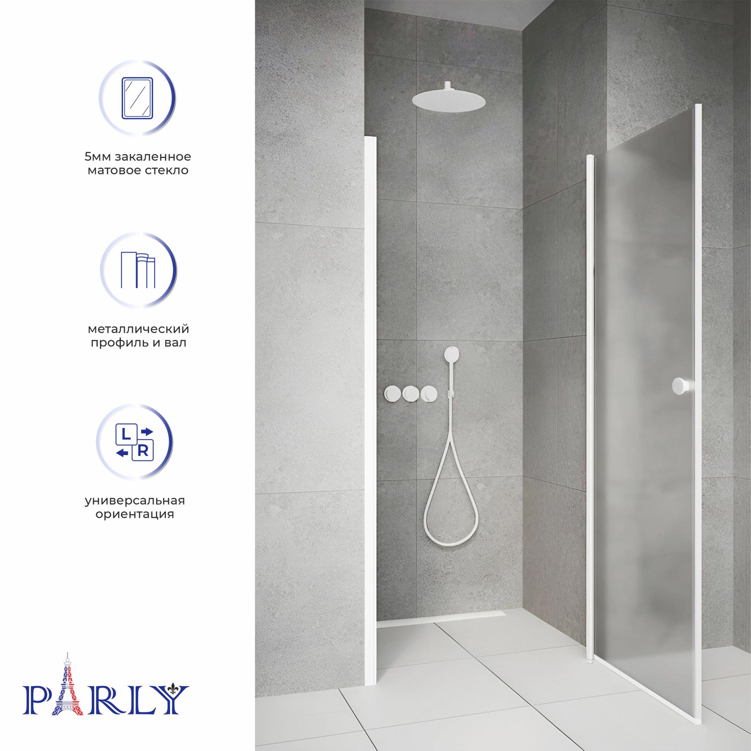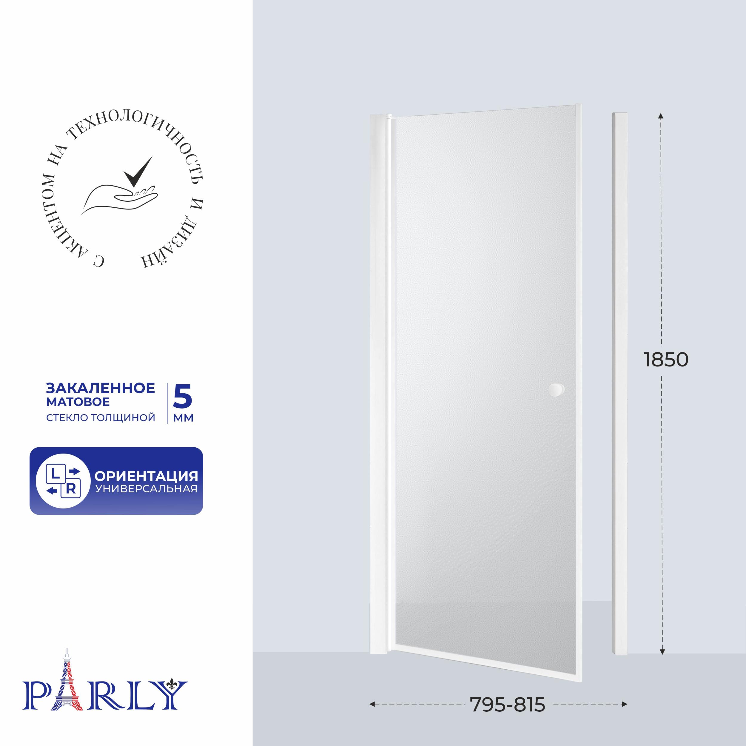 Душевая дверь Parly DE80F 800х1850 мм, стекло - матовое 5 мм, профиль белый. Ширина входа 700 мм. Габариты регулировки 795-815х1850 мм.