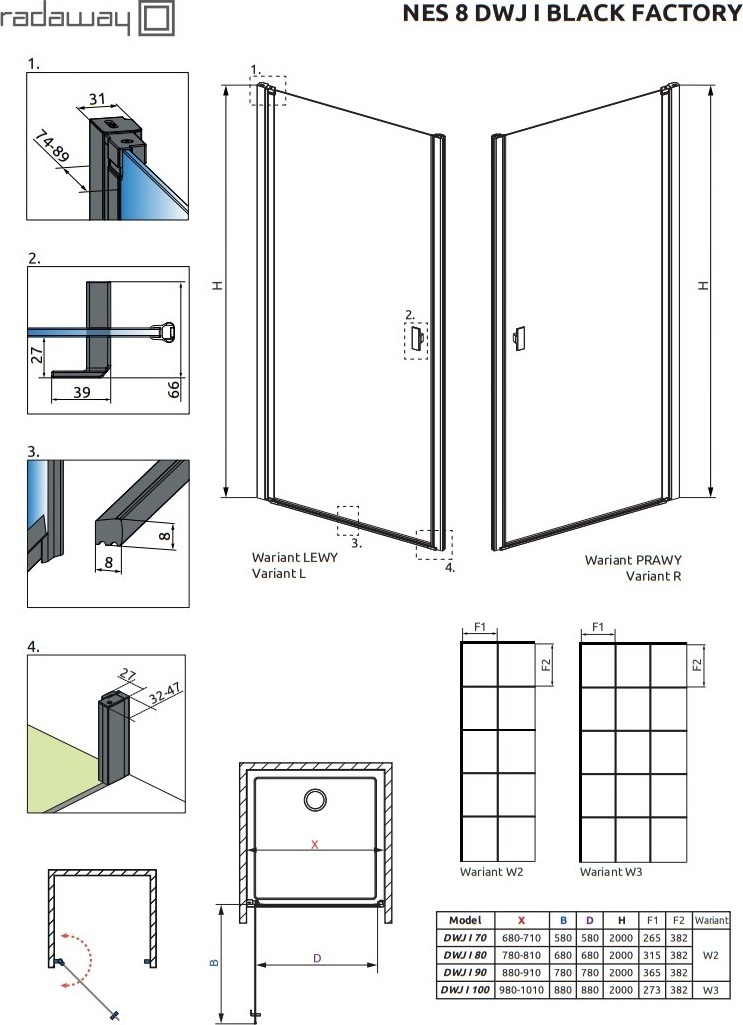Душевая дверь Radaway Nes 8 Black DWJ I Factory 700х2000 мм, стекло - Factory (прозрачное с черным принтом 8 мм), профиль - черный. Душевой поддон приобретается отдельно.