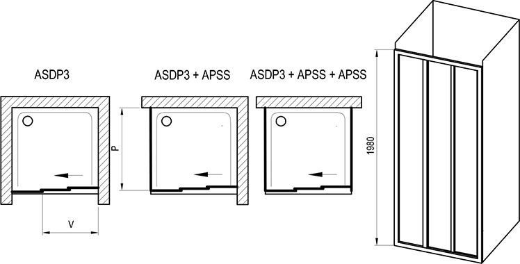 Душевые двери 80х198 см раздвижные, трехэлементные Ravak Supernova ASDP3 - 80, профиль - сатин, стекло - Transparent, вход 395 мм.