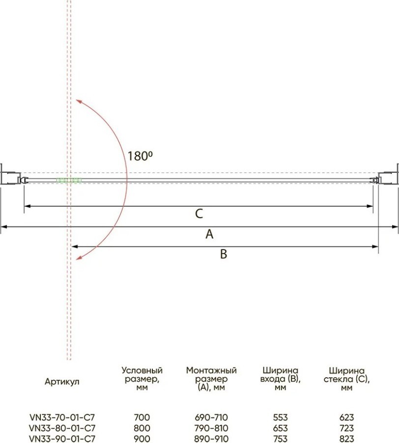 Душевая дверь Veconi Vianno VN33R-70-06-C7, размер 70х195 см, профиль хром, стекло матовое, вход 553 мм. Габариты регулировки (690—710)х1950 мм.