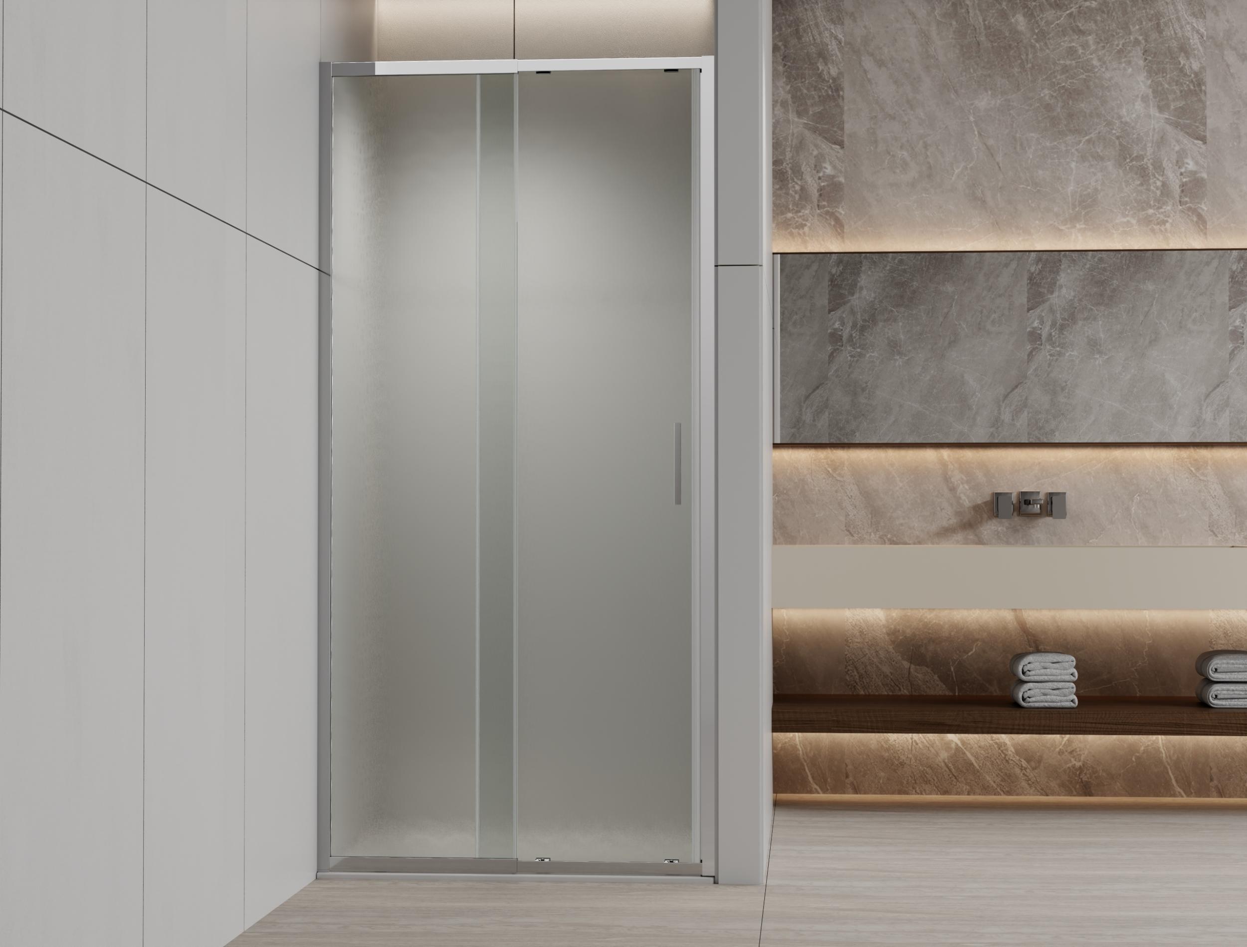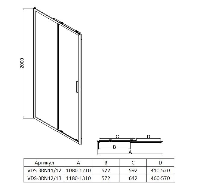 Душевая дверь Vincea Rapid-N VDS-3RN12/13MT 1200-1300х2000 мм, стекло - текстурное 6 мм, профиль - хром, ширина входа - 460-570 мм, габариты с диапазоном регулировок: 1180-1310 мм, расширенная регулировка 120мм за счет специальной конструкции телескопического профиля. Поддон приобретается отдельно.