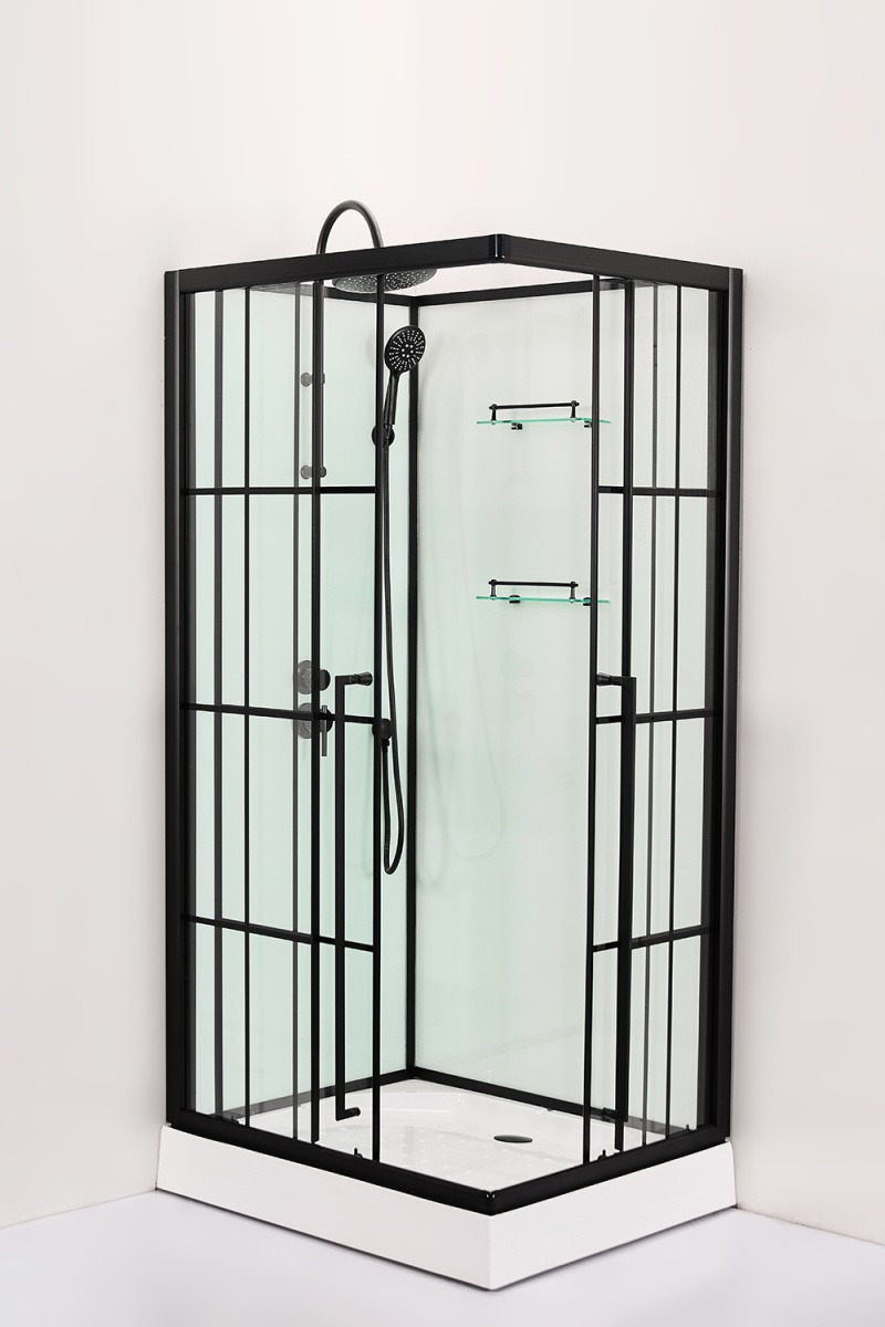 Душевая кабина Loranto CS-3008TMW-100L с низким поддоном, левосторонняя, размер 980х980х2040 мм, ширина входа 570 мм, профиль чёрный, стекло прозрачное 4 мм. Задние стенки стеклянные белые.
