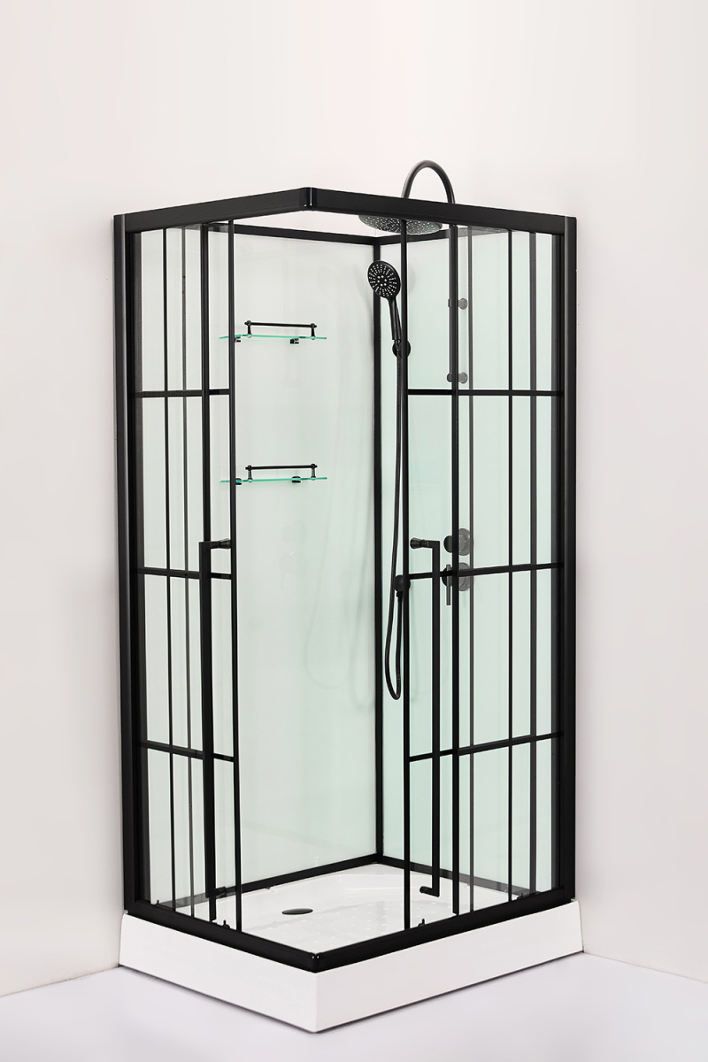 Душевая кабина Loranto CS-3008TM/W-90R с низким поддоном, правосторонняя, размер 880х880х2040 мм, ширина входа 470 мм, профиль чёрный, стекло прозрачное 4 мм. Задние стенки стеклянные белые.