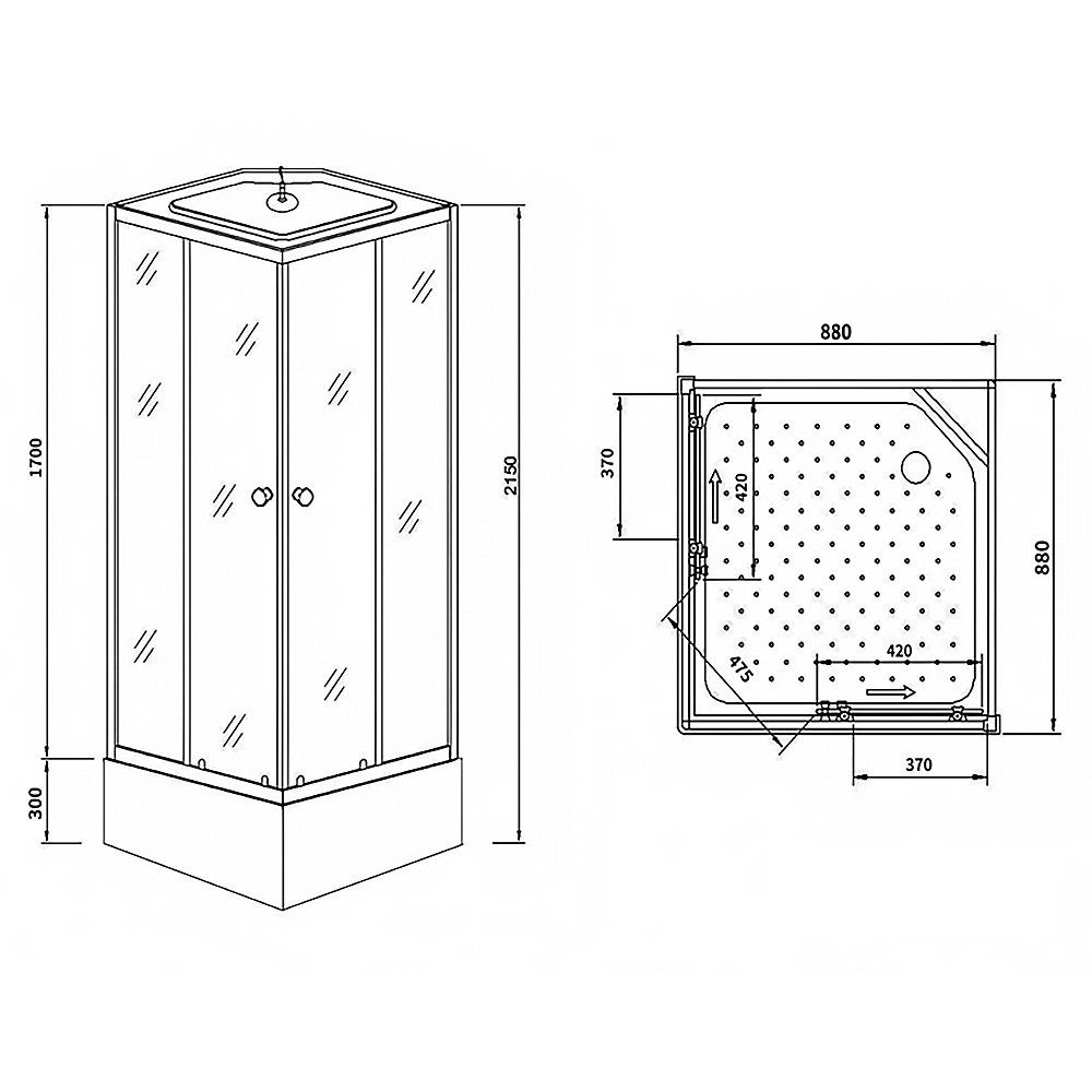 Душевая кабина Loranto CS-990ETM/W-90 со средним поддоном, размер 880х880х2150 мм, профиль хром, стекло матовое, цвет задней стенки белый. Ширина входа 475 мм.