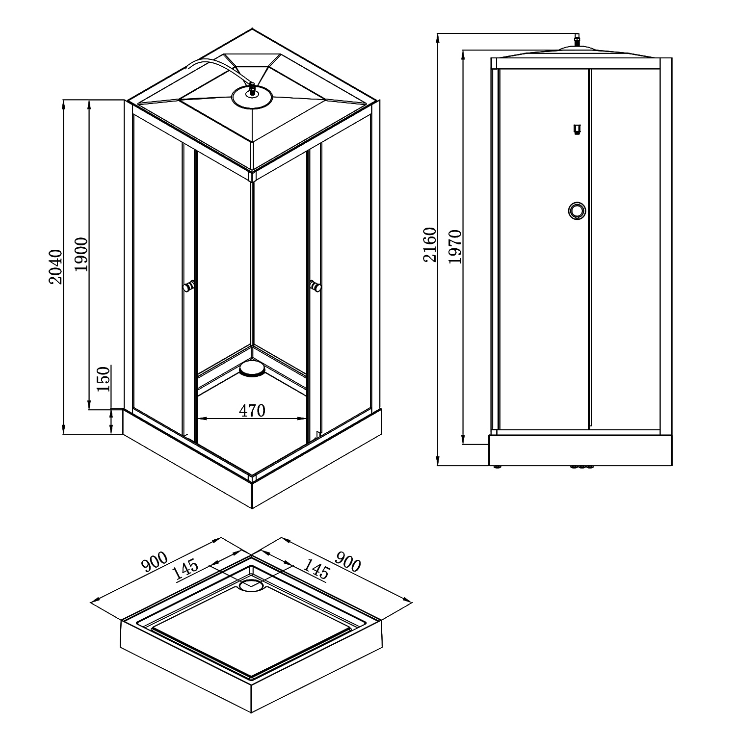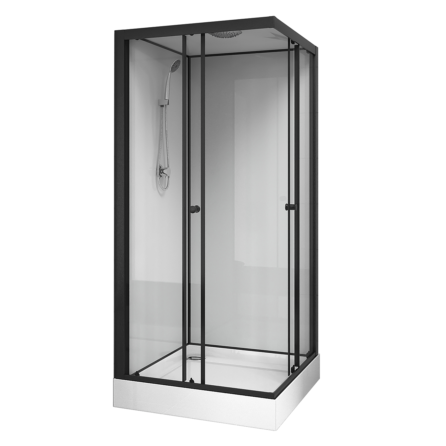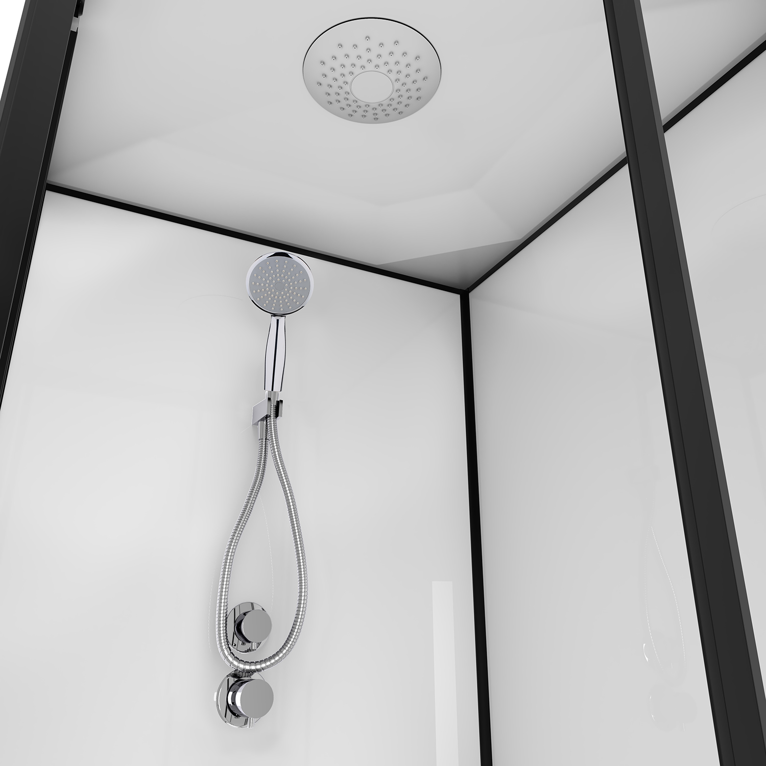 Душевая кабина Loranto Neo с низким поддоном, размер 900х900х2050 мм, профиль чёрный, стекло прозрачное 5 мм. Задние стенки стеклянные белые.