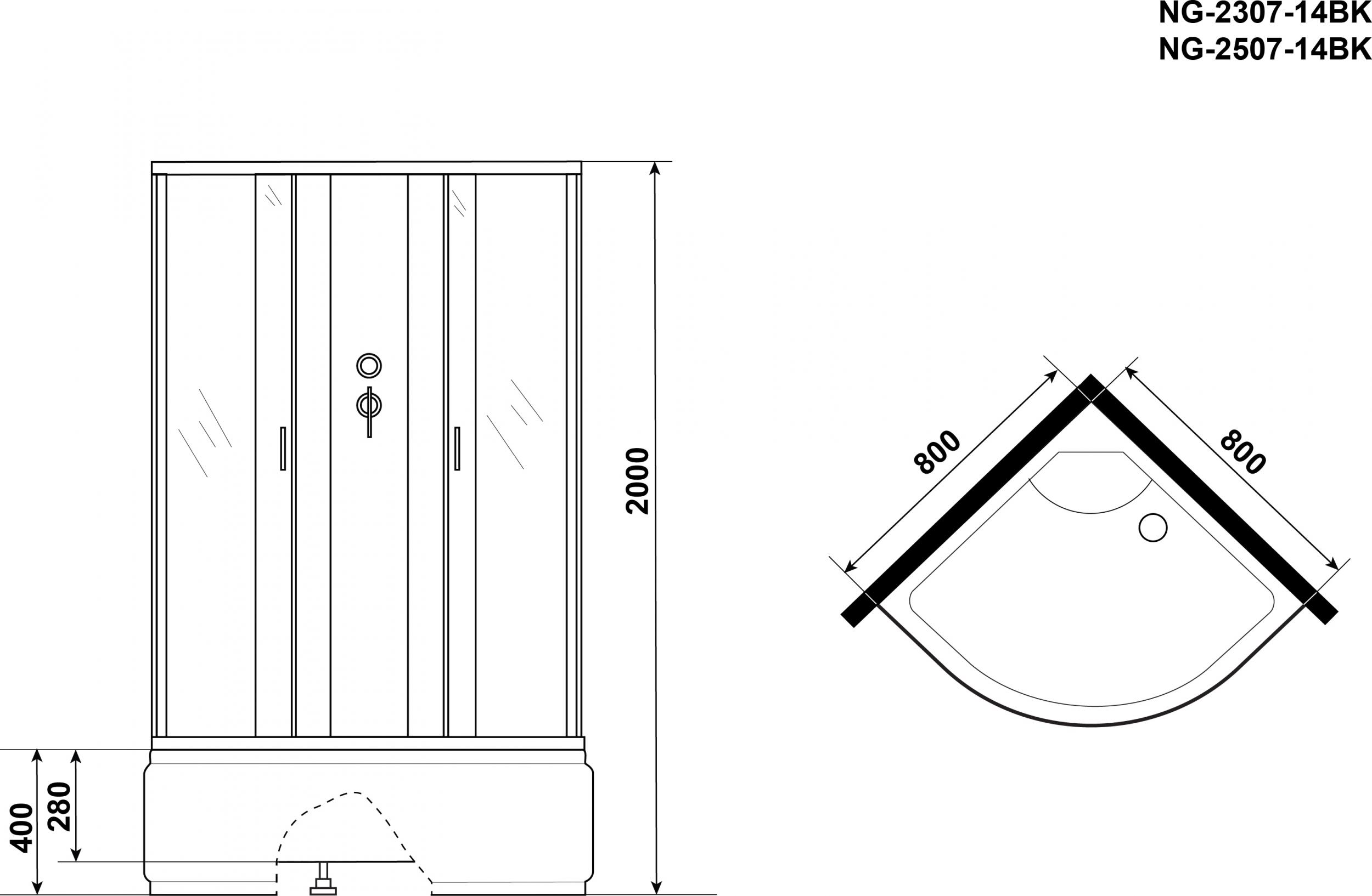 Душевая кабина Niagara NG-2307-14BK с высоким поддоном, размер 800x800x2000 мм, профиль серебро, стекло матовое, вход 500 мм.