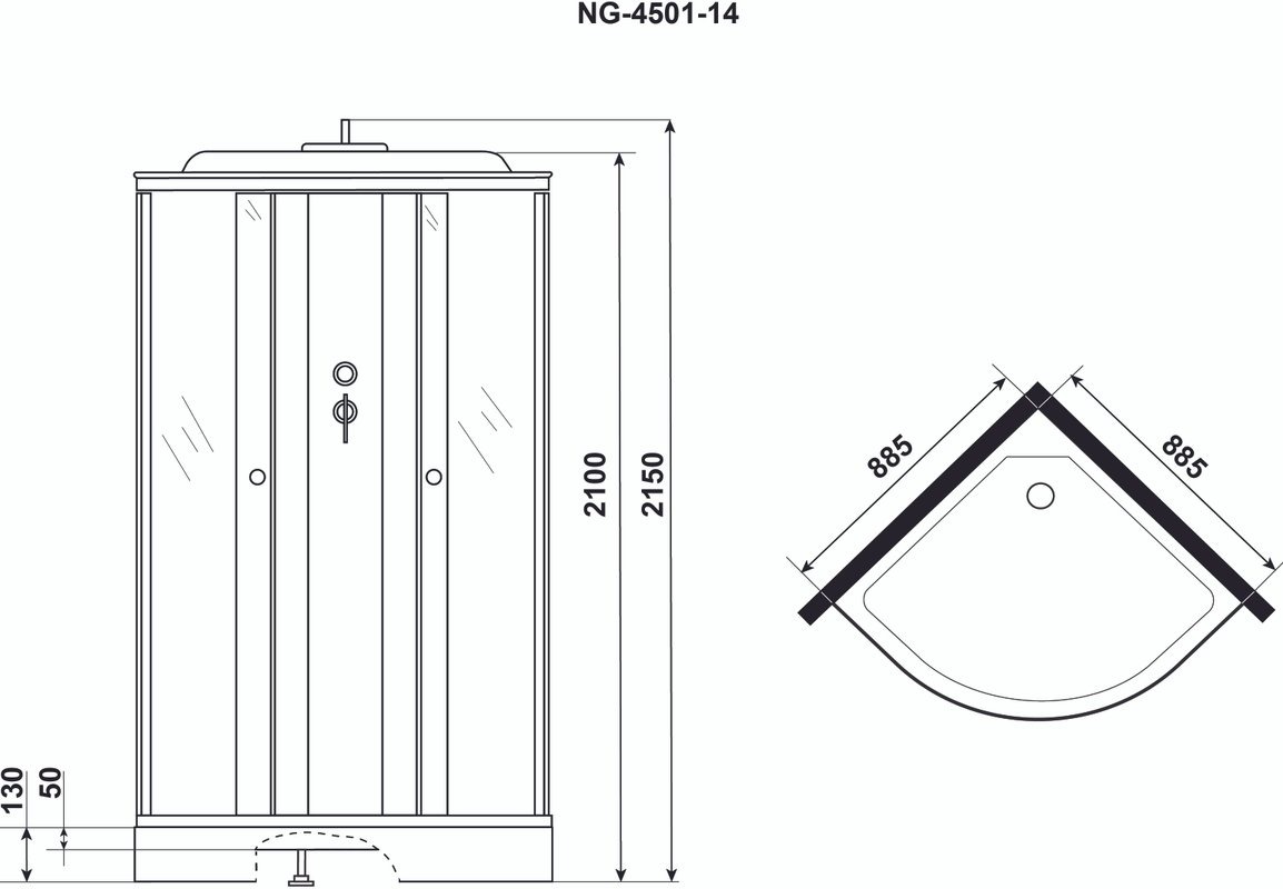 Душевая кабина Niagara Eco NG-4501-14 с низким поддоном, размер 885x885x2150 мм, цвет задних стенок чёрный. Ширина входа 420 мм. Низкий поддон и сифон в комплекте.
