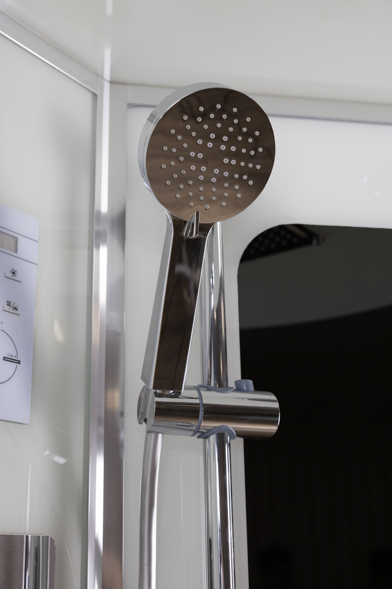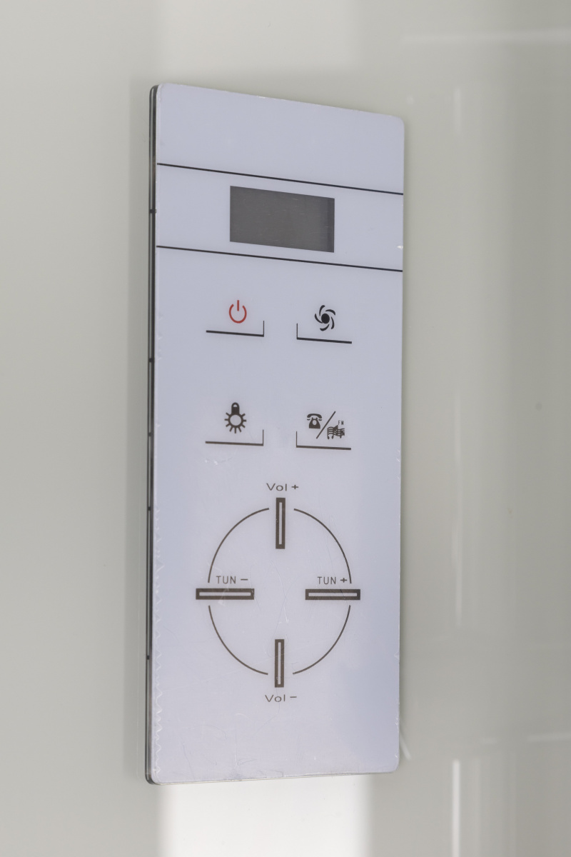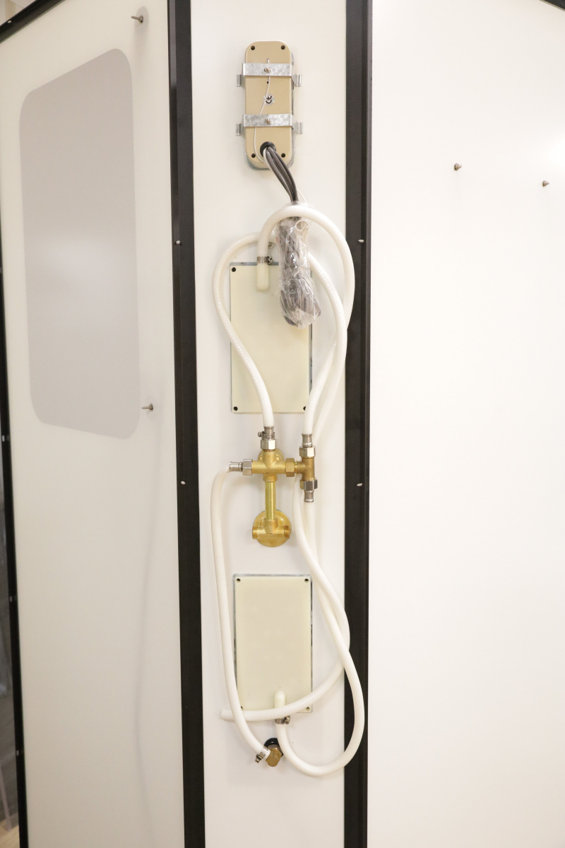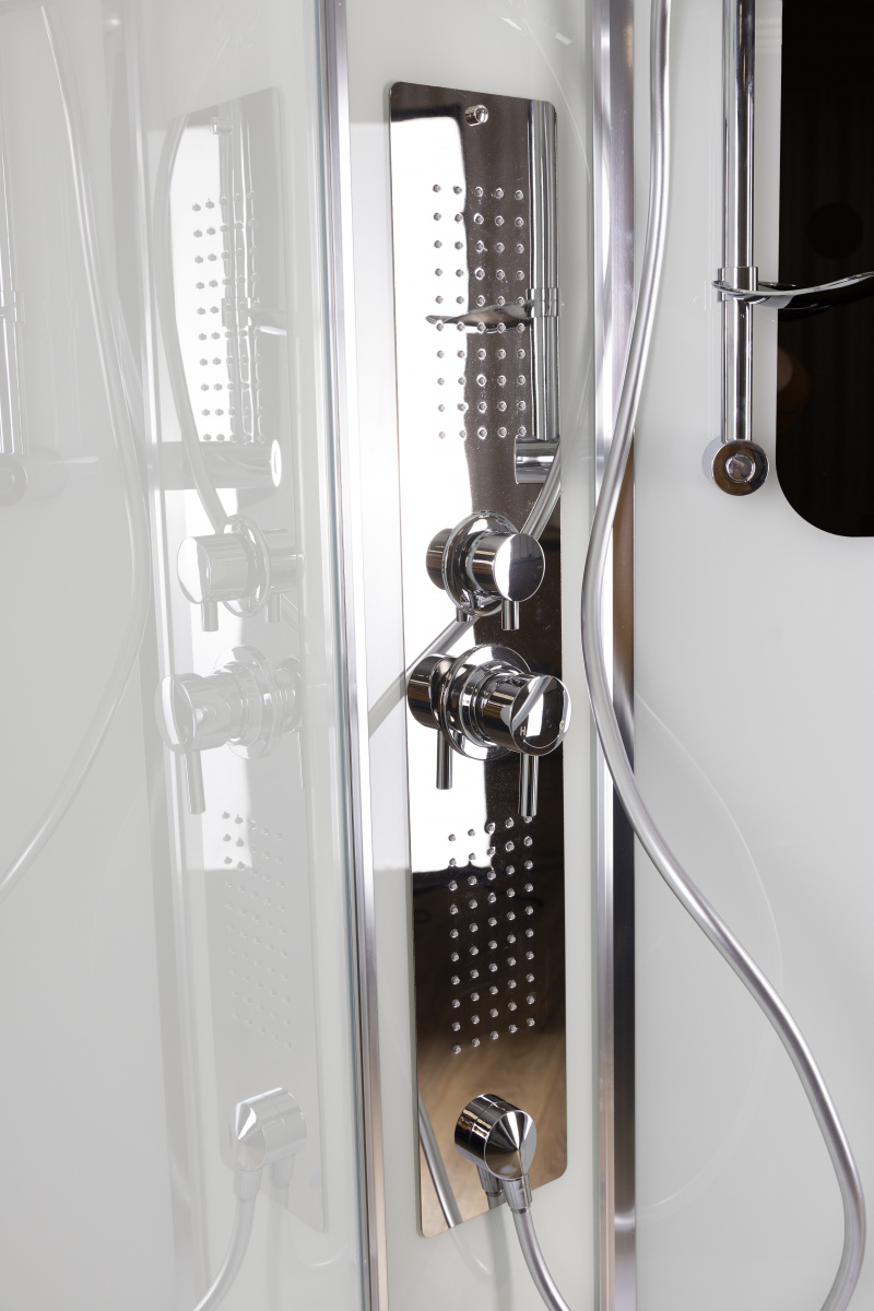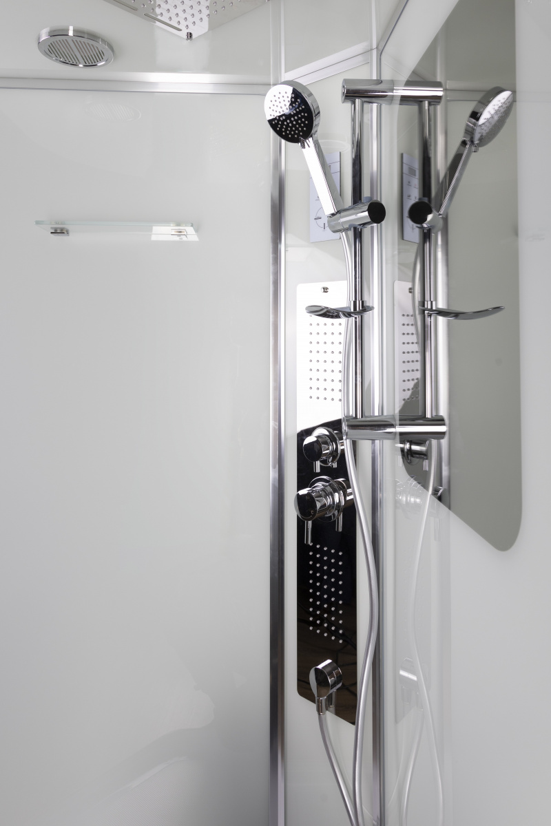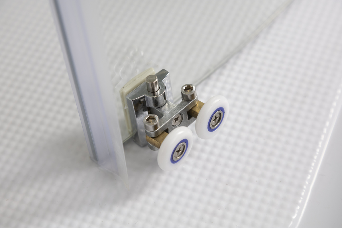 - Двери и переднее стекло: Прозрачные 6 мм, двери зарываются плотно с помощью магнитной ленты, вода не выплёскивается так как установлены брызговики между дверью и неподвижной стенкой. Ручки дверей железные. Ролики стальные и надежные.