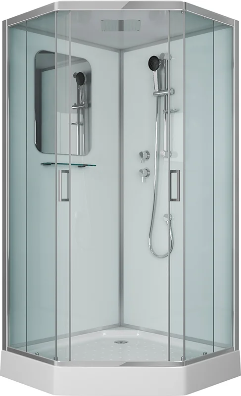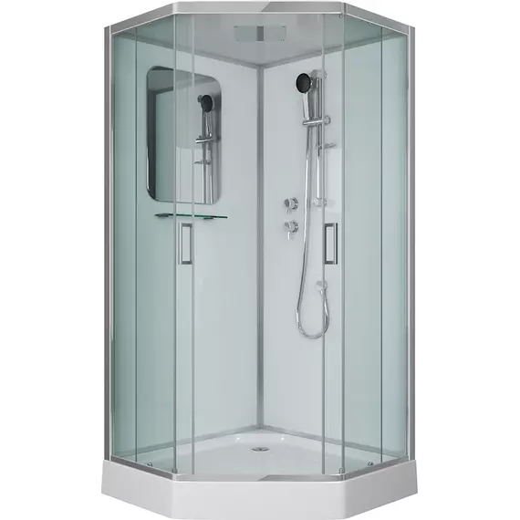- Комплектация: Сифон, тропический душ, шланг душа, штанга с мыльницей, полочка, зеркало, ролики, смеситель.