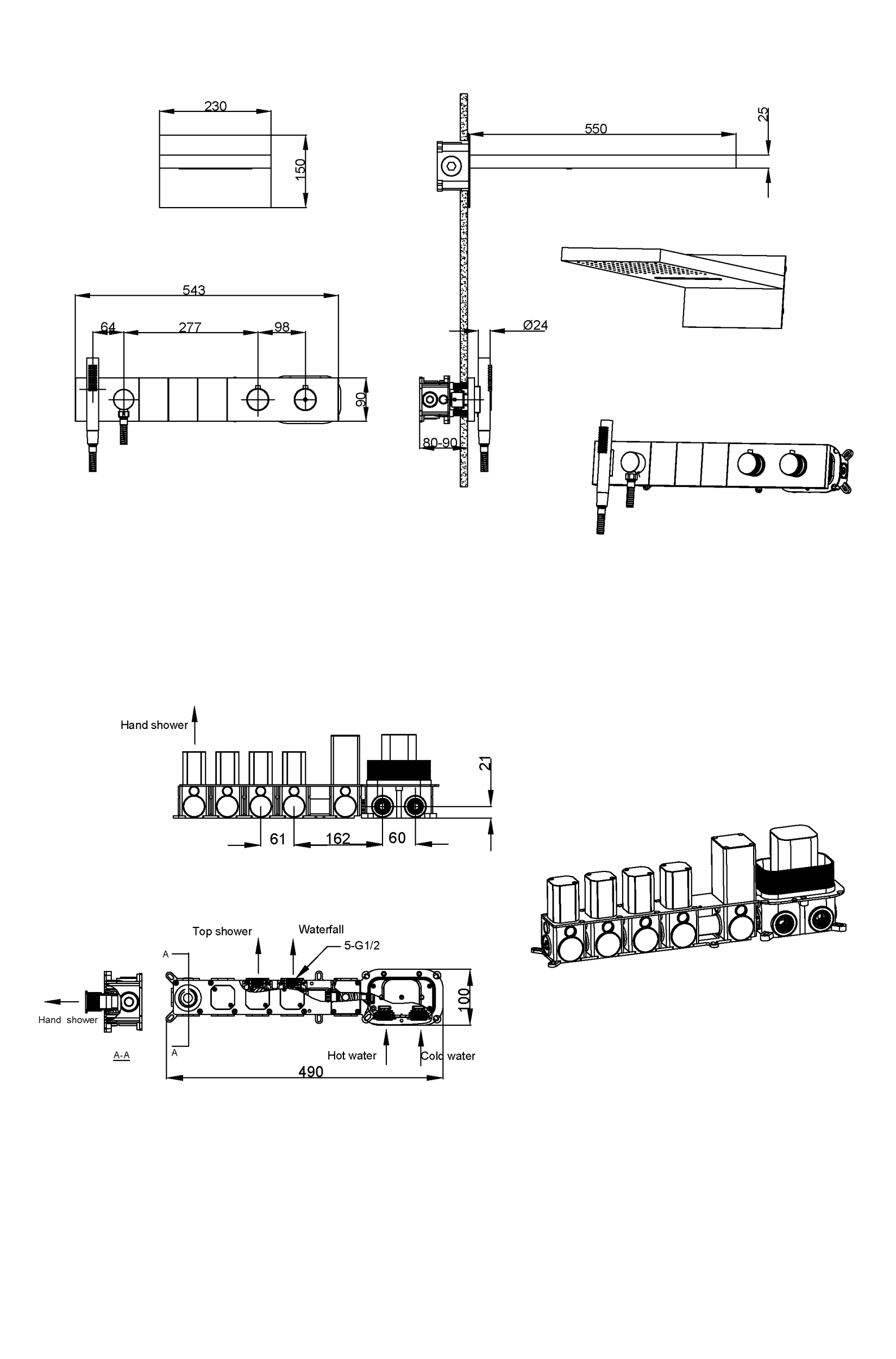 - Верхний душ размером 550мм*230мм с функцией тропического душа и водопада.