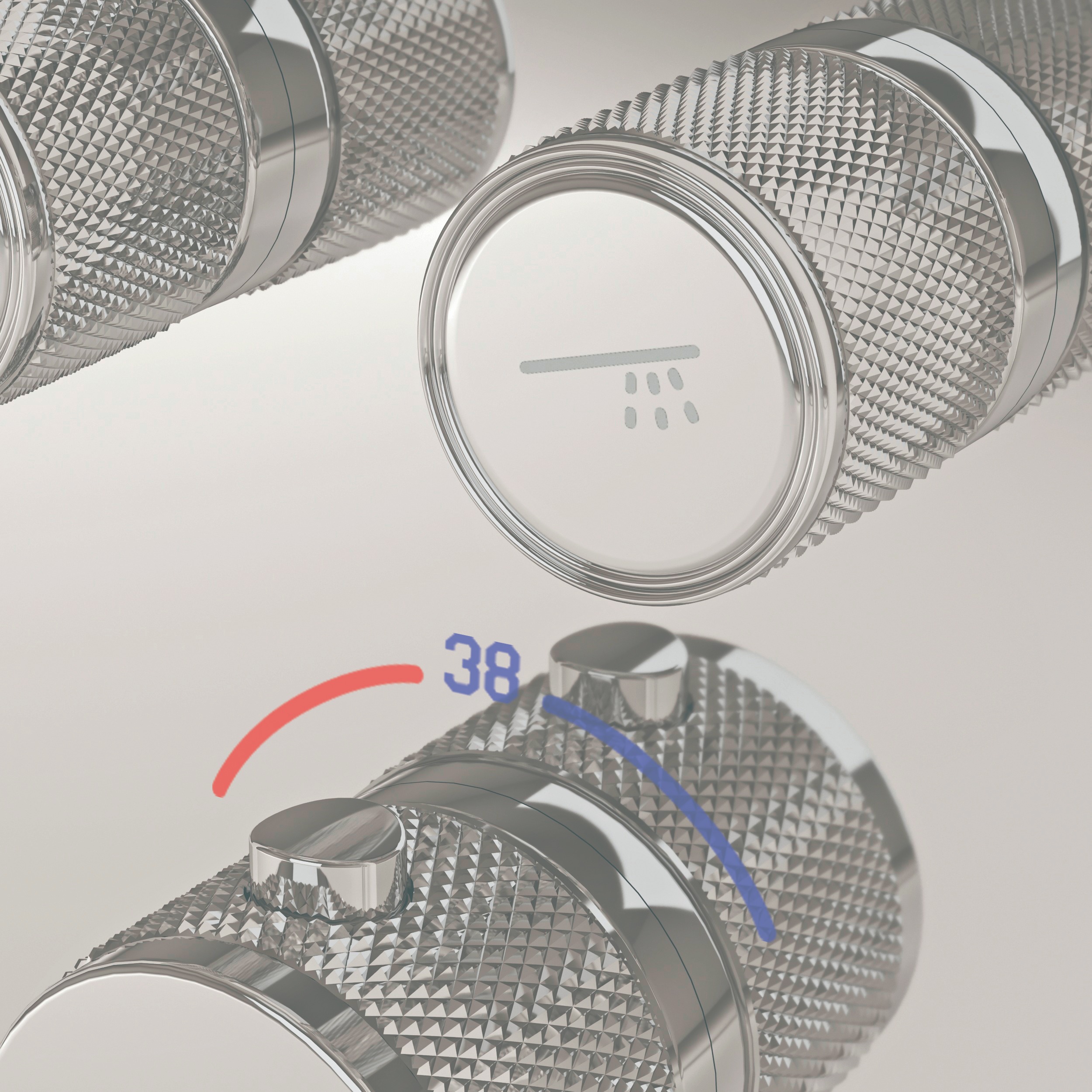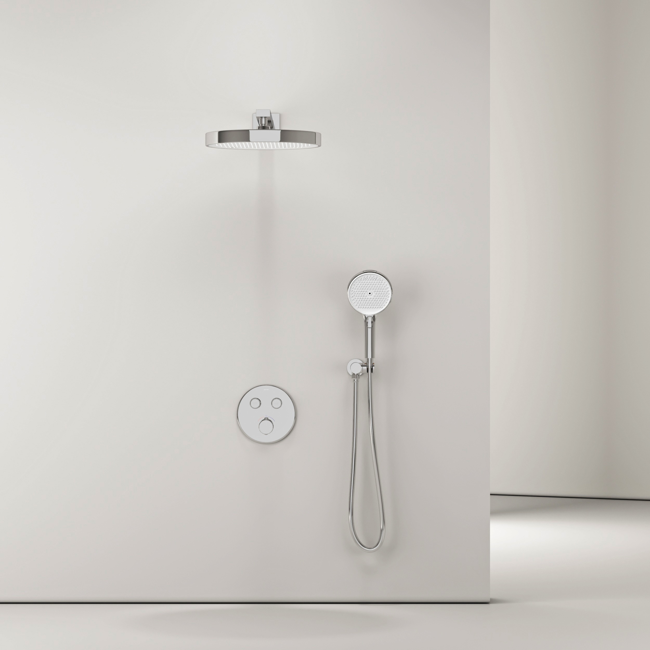 - Встраиваемый термостатический смеситель с внутренним блоком в комплекте. Удобное кнопочное управление между источниками воды.