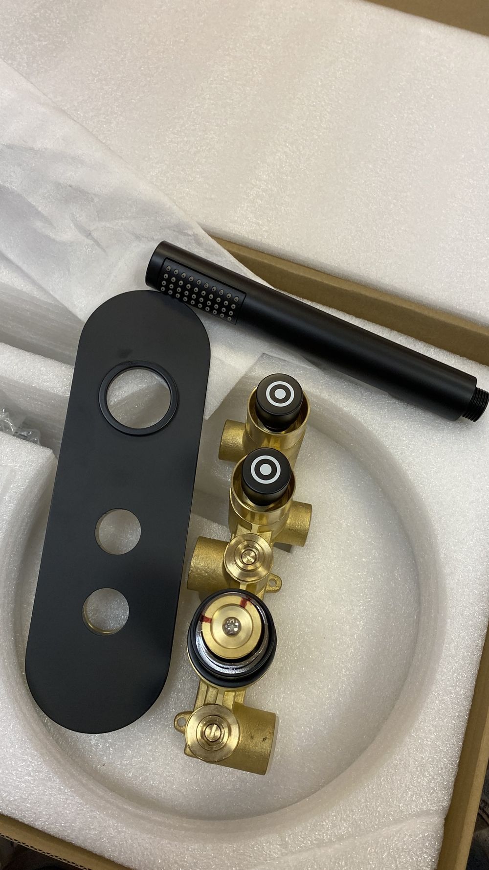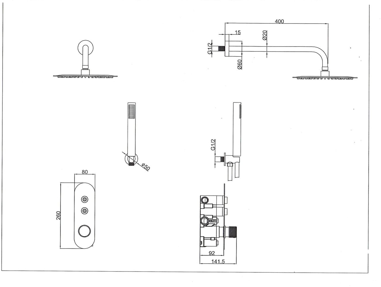 - Состав комплекта: верхний душ, душевой гарнитур, смеситель для душа, настенный держатель, шланговое подключение