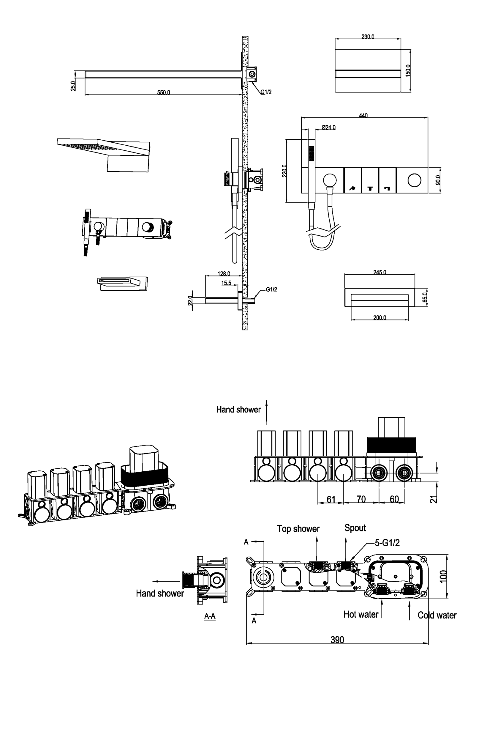 - Верхний душ размером 550мм*230мм с функцией тропического душа.