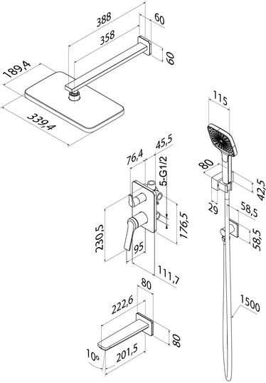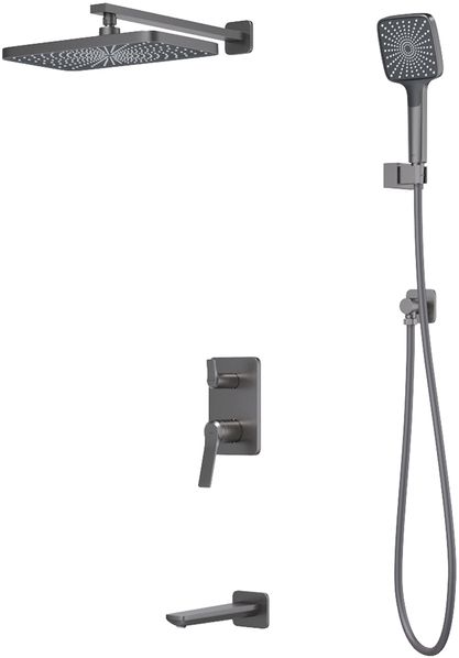 - Встраиваемая душевая система Parker в матовом графите - практичная и стильная, ее дизайн сочетает в себе трендовый минимализм форм и четкие грани.Готовый комплект включает всё необходимое для создания уютного и функционального пространства: смеситель, верхняя лейка с кронштейном для тропического душа, настенный излив, большая ручная лейка с 3 режимами, душевой шланг 1,5 м и выход для подключения шланга с держателем.