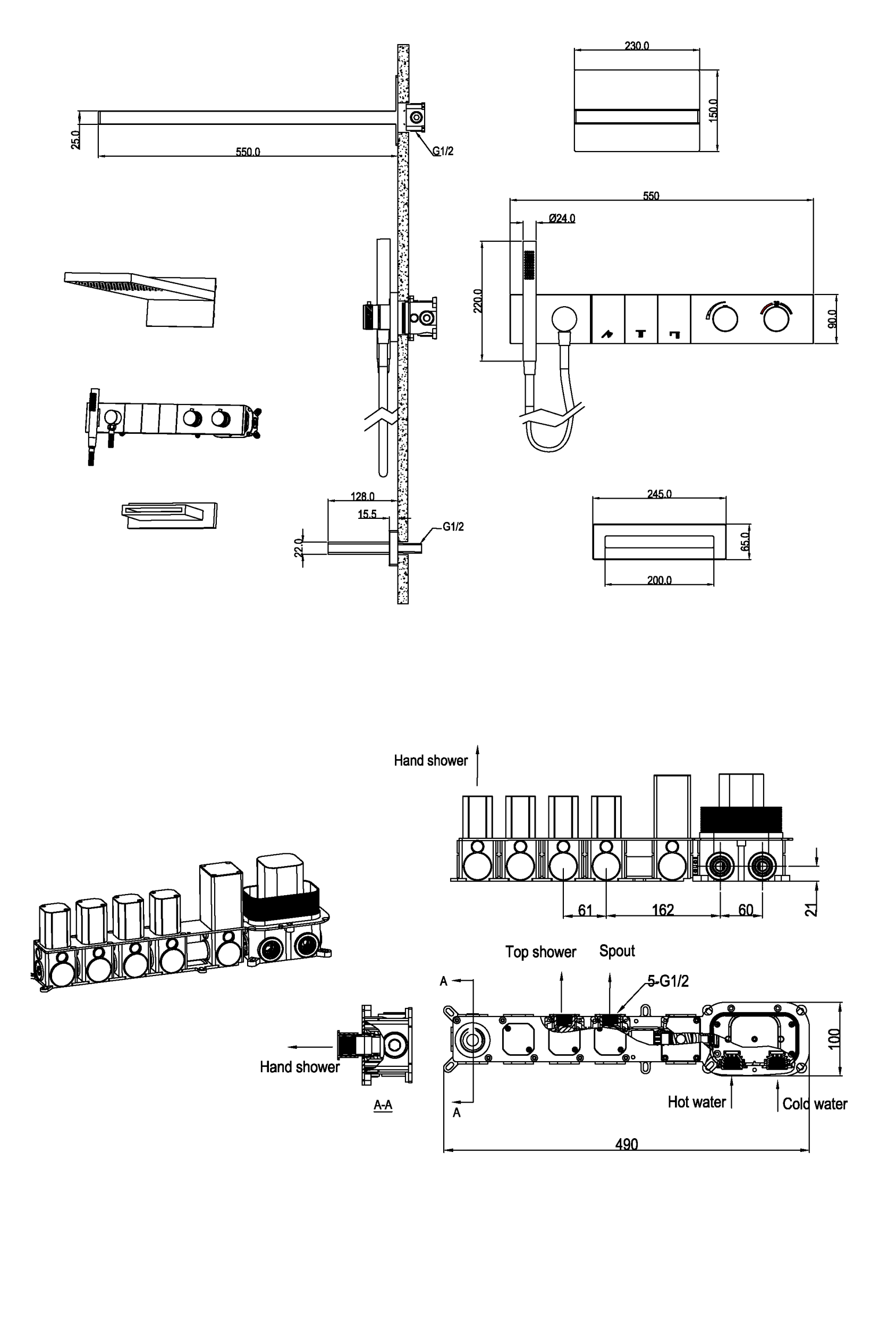 - Верхний душ размером 550мм*230мм с функцией тропического душа.
