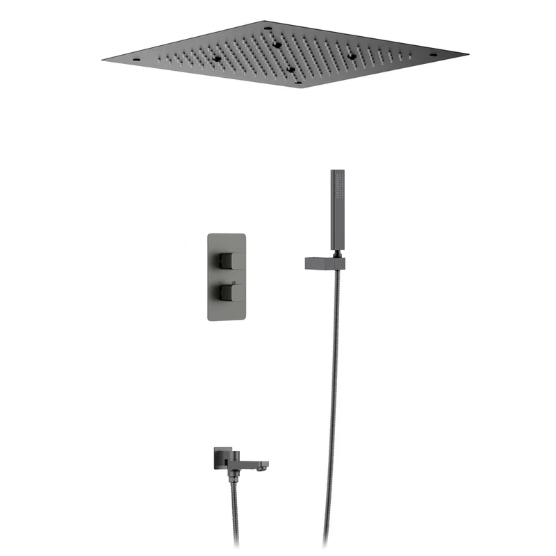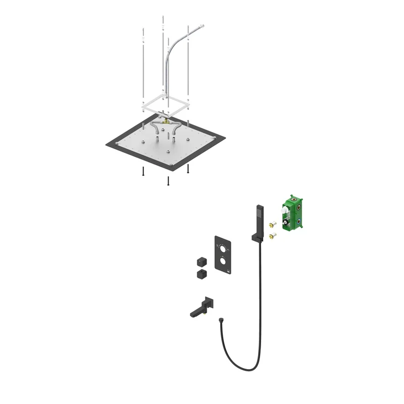 Состав комплекта: верхний душ, душевой гарнитур, излив, смеситель для ванны с душем, настенный держатель, шланговое подключение.