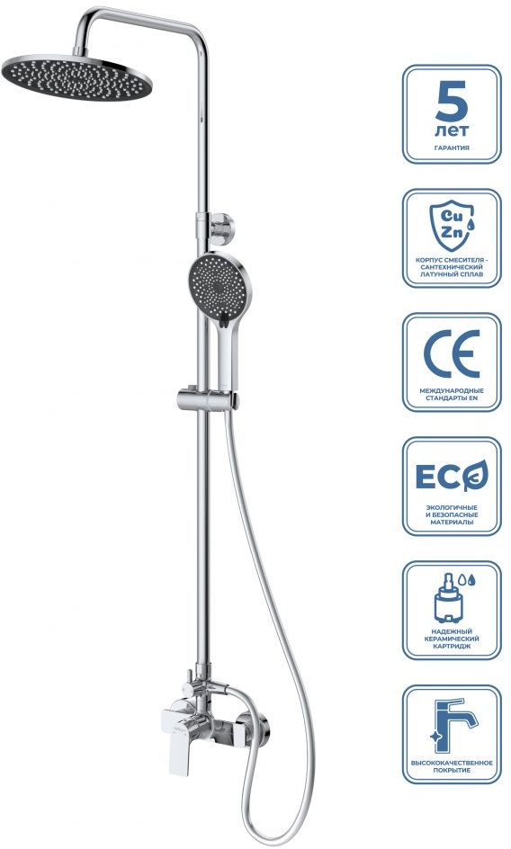 - Оснащение: эксцентрики, дивертор, душевой шланг ПВХ длиной 150 см, ручной душ 3-х режимный, верхний душ, смеситель