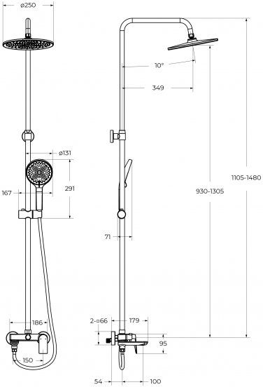 - Оснащение: эксцентрики, душевой шланг ПВХ длиной 150 см, ручной душ 3-х режимный, верхний душ, смеситель с поворотным изливом для ванны и дивертором
