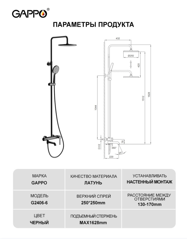 Характеристики душевая система с изливом Gappo (G2406-6)