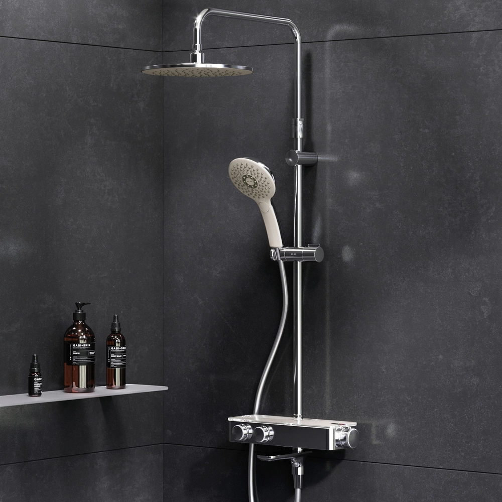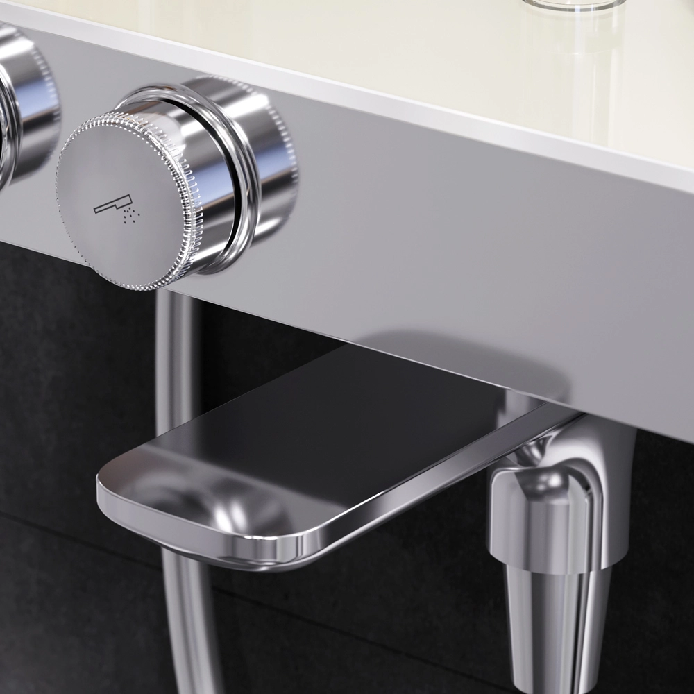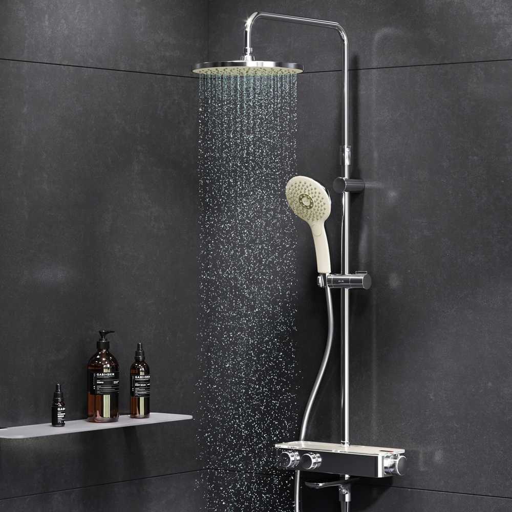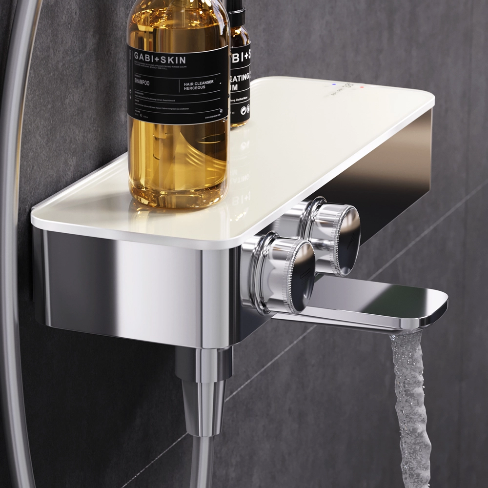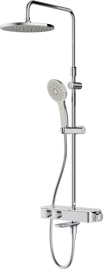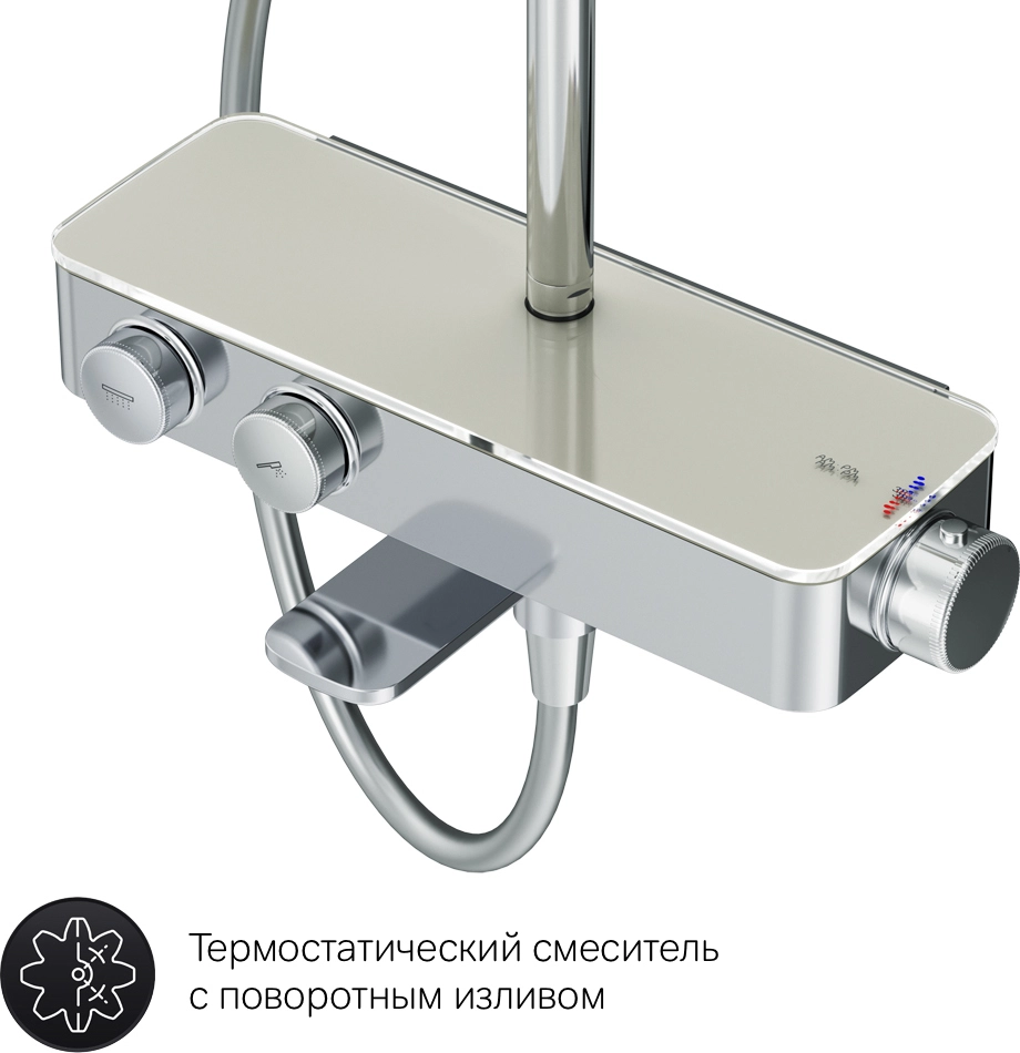 Душевая система Inspire V2.0 – это новый уровень удовольствия от принятия душа благодаря возможности индивидуальной настройки. Вы можете управлять верхним и ручным душами с помощью удобных контроллеров расположенных на передней панели. Включайте воду легким нажатием меняйте напор плавным поворотом ручки – и наслаждайтесь идеальным душем снова и снова ведь система запоминает выбранные вами параметры. Продукт оснащен термостатическим смесителем для поддержания неизменной температуры воды. Верхняя часть смесителя выполнена из глянцевого стекла и является интегрированной полочкой для нужных мелочей при приёме душа. Удобный поворотный излив. Удивительно тактильный ручной душ за счёт материала поверхности soft touch.