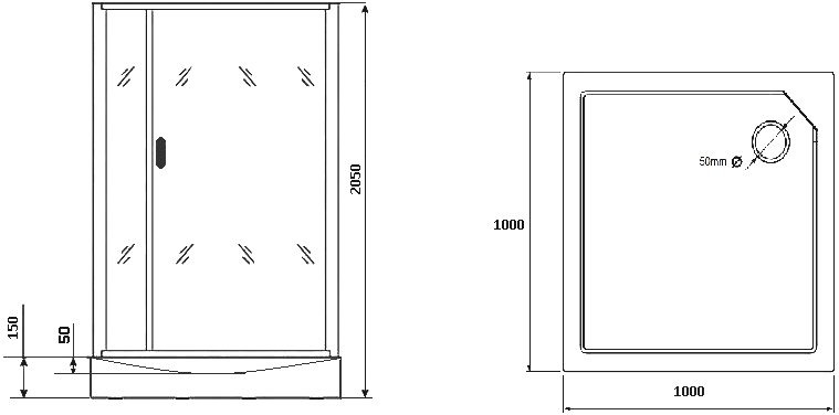 Квадратная душевая кабина Grossman GR-270QR имеет габаритные размеры 100 на 100 см и правостороннюю ориентацию. Это означает, что распашная дверь шириной 51 см расположена на правой передней стенке кабины.