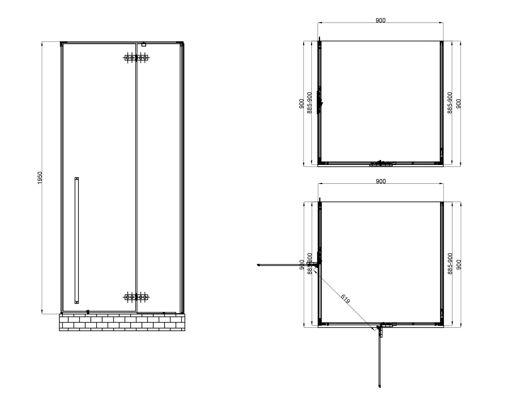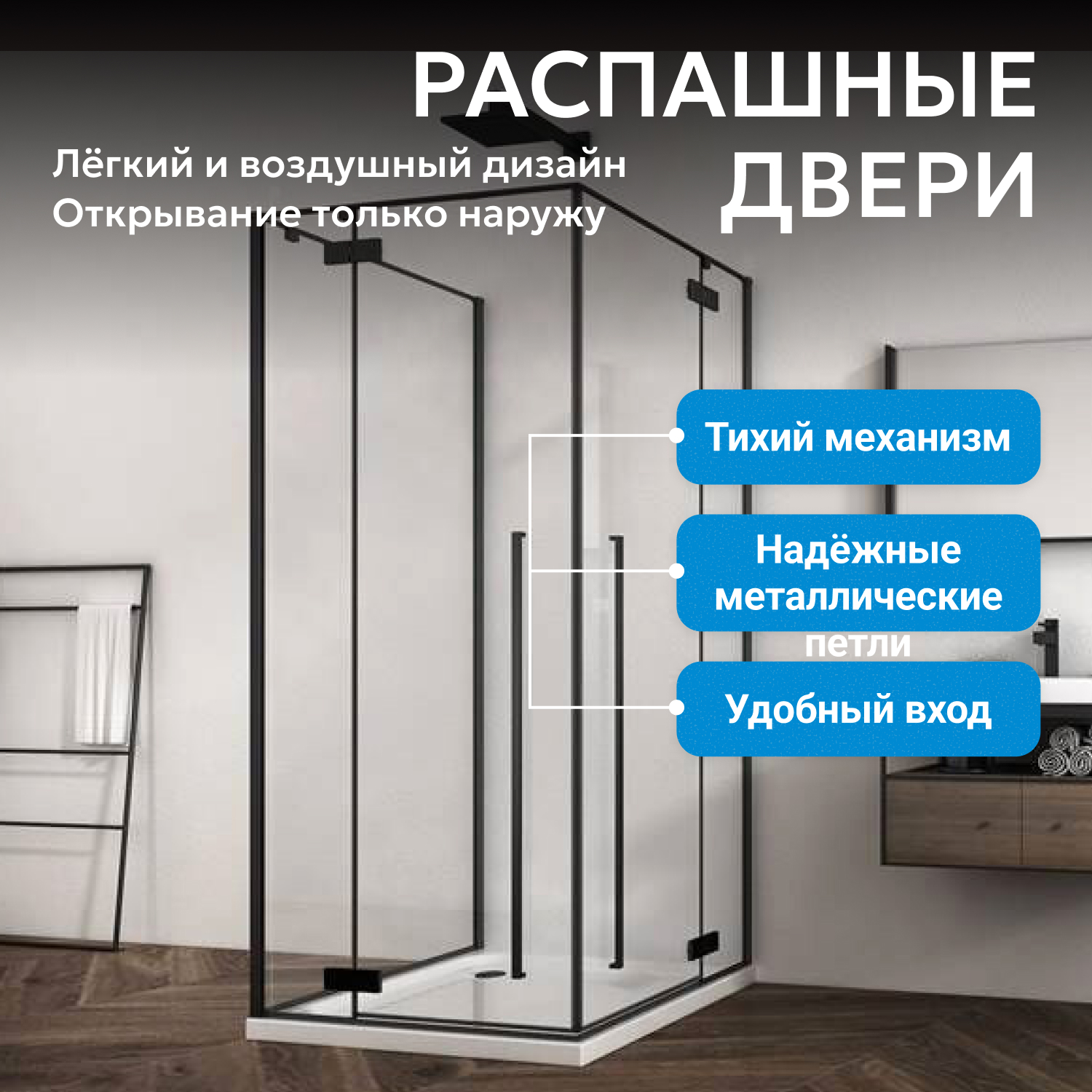 Подходит для проектов, где требуется душевой уголок без поддона, угловой душевой уголок 90×90 или аналогичные большие душевые уголки с черным профилем и усиленной фурнитурой.