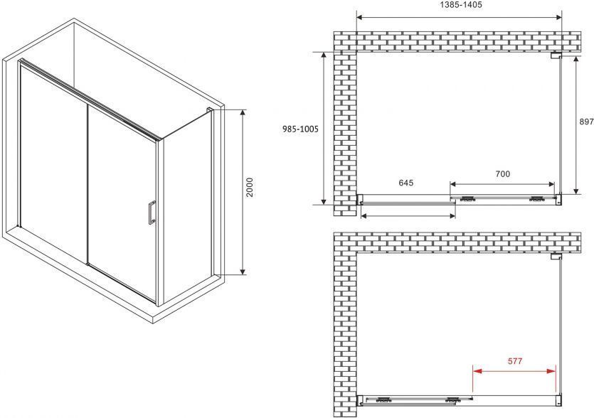 Душевое ограждение Abber Komfort, размер 1400х1000х2000 мм, профиль хром, стекло прозрачное 8 мм, габариты регулировки (1385-1405)х(985-1005)х2000 мм, вход 577 мм. Поддон приобретается отдельно. Дверь 140 см, душевая стенка 100 см.