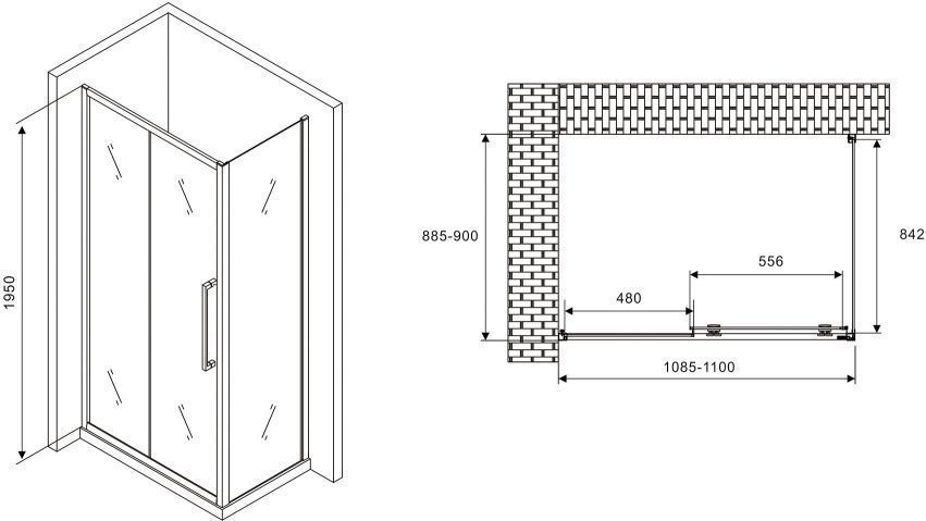 Душевое ограждение Abber Schwarzer Diamant, размер 1100х900х1950 мм, профиль хром, стекло матовое 6 мм. Габариты регулировки (1085-1100)х(885-900)х1950 мм. Поддон приобретается отдельно. Дверь 110 см, душевая стенка 90 см.