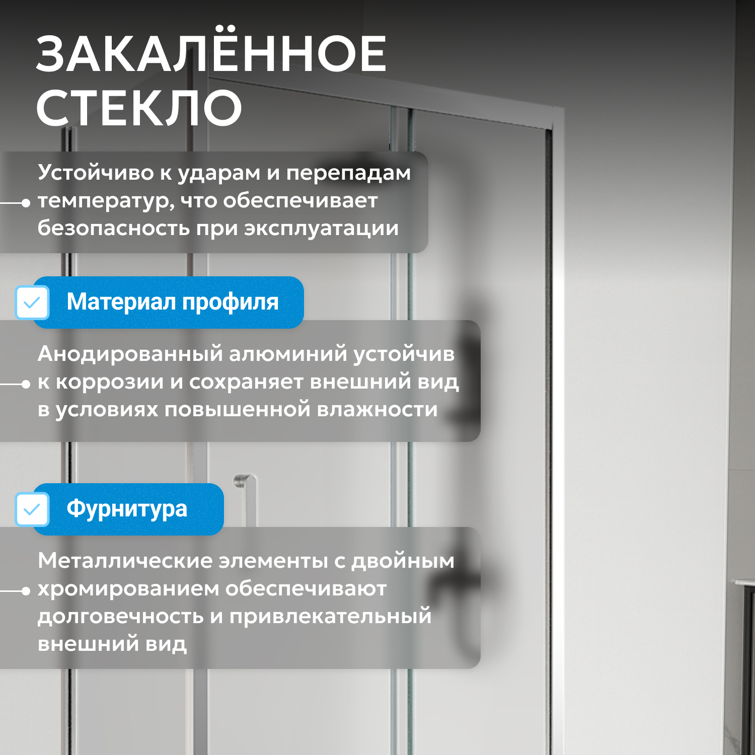 - Прямоугольная конфигурация оснащена раздвижной дверью на двойных роликах для плавности хода и стабильности при ежедневной эксплуатации. Металлическая ручка облегчает открытие даже мокрыми руками, повышая эргономику.