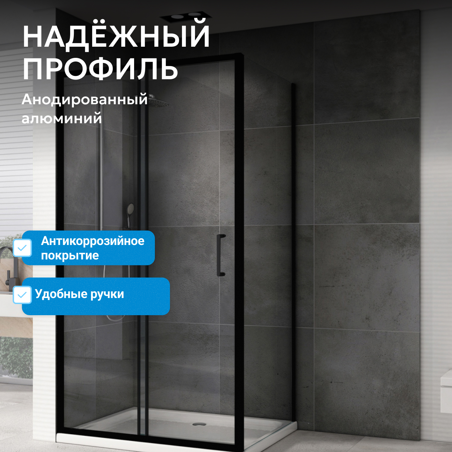 - Ширина входа 494 мм и высота 1900 мм обеспечивают свободу движений. Стекло устойчиво к перепадам температур, профиль долговечен и защищен от влаги.