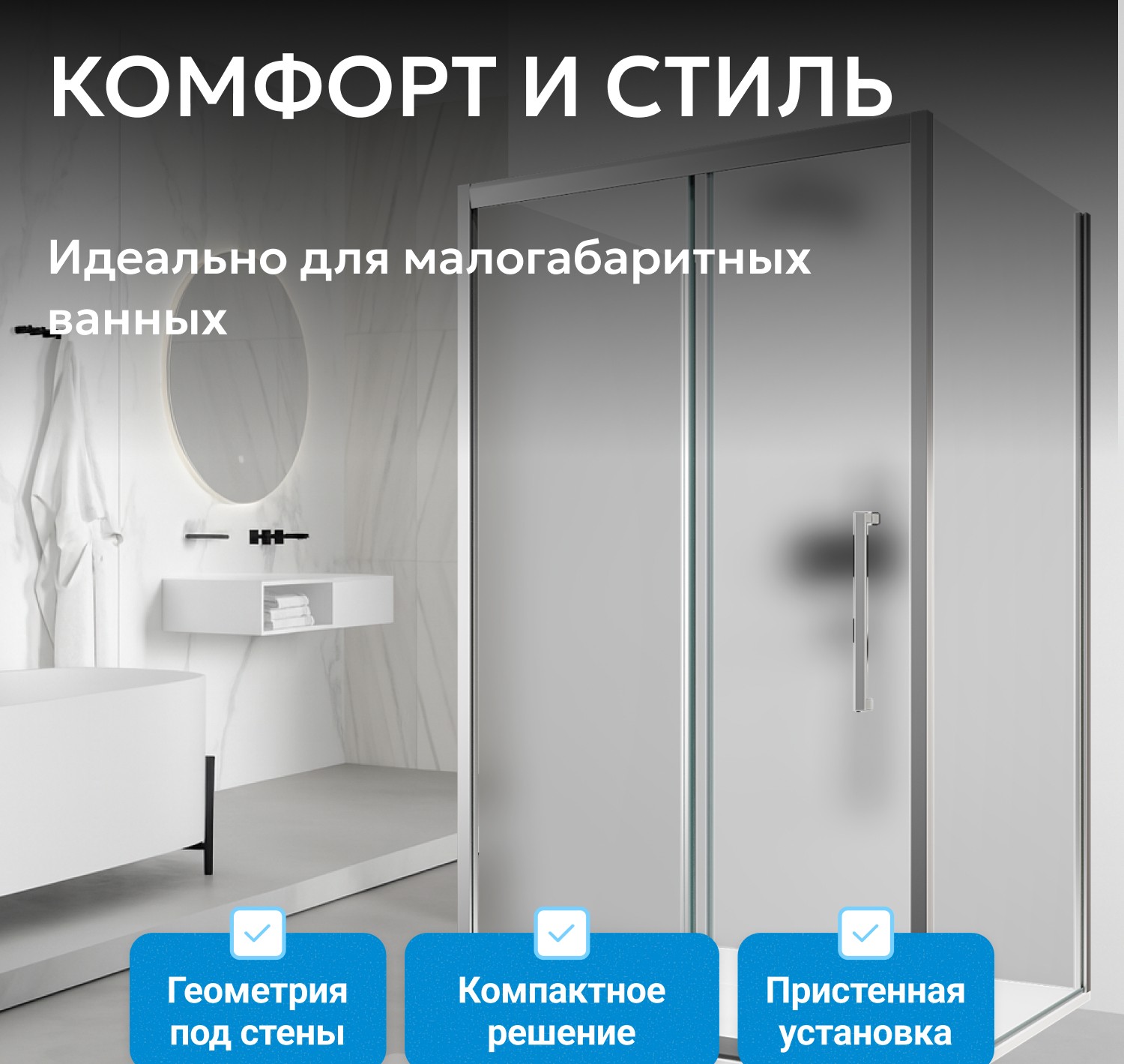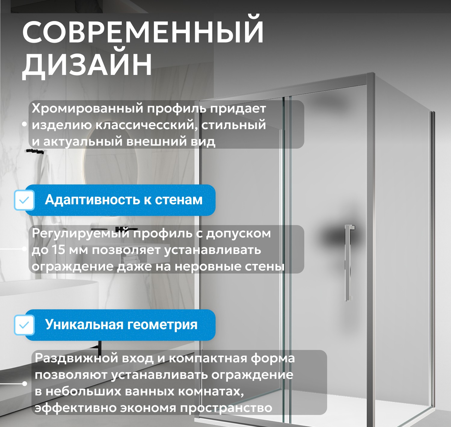 - Каркас с хромированным антикоррозийным покрытием сохраняет привлекательный вид и надежность. Раздвижная дверь на двойных роликах обеспечивает плавный ход и фиксацию полотна. Металлическая ручка удобна и долговечна. Пристенный монтаж подходит для любой планировки.