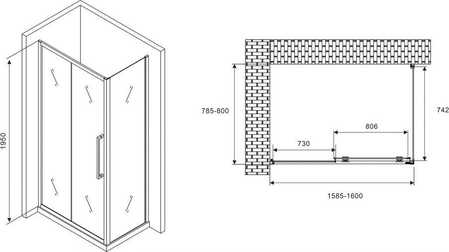 Душевое ограждение Abber Schwarzer Diamant AG30160H-S80 1600х800х1950 мм, профиль - хром, стекло - прозрачное 6 мм. Поддон приобретается отдельно. Дверь 160 см, душевая стенка 80 см.