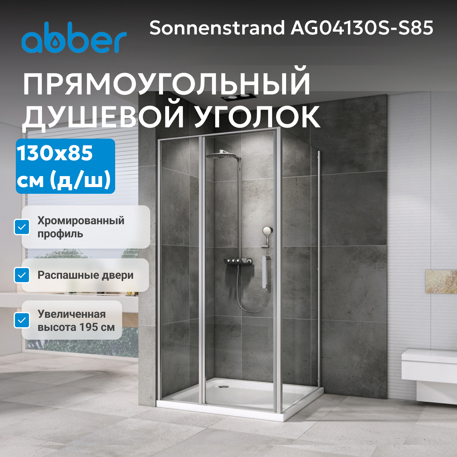 - Изделие выполнено брендом ABBER с учетом немецких стандартов и современного дизайна. Прямоугольная форма 130×85×195 см обеспечивает комфортное пространство. Прозрачное 6 мм стекло гарантирует прочность и легкость, хромированный профиль и металлическая ручка придают изделию надежность и современный внешний вид.