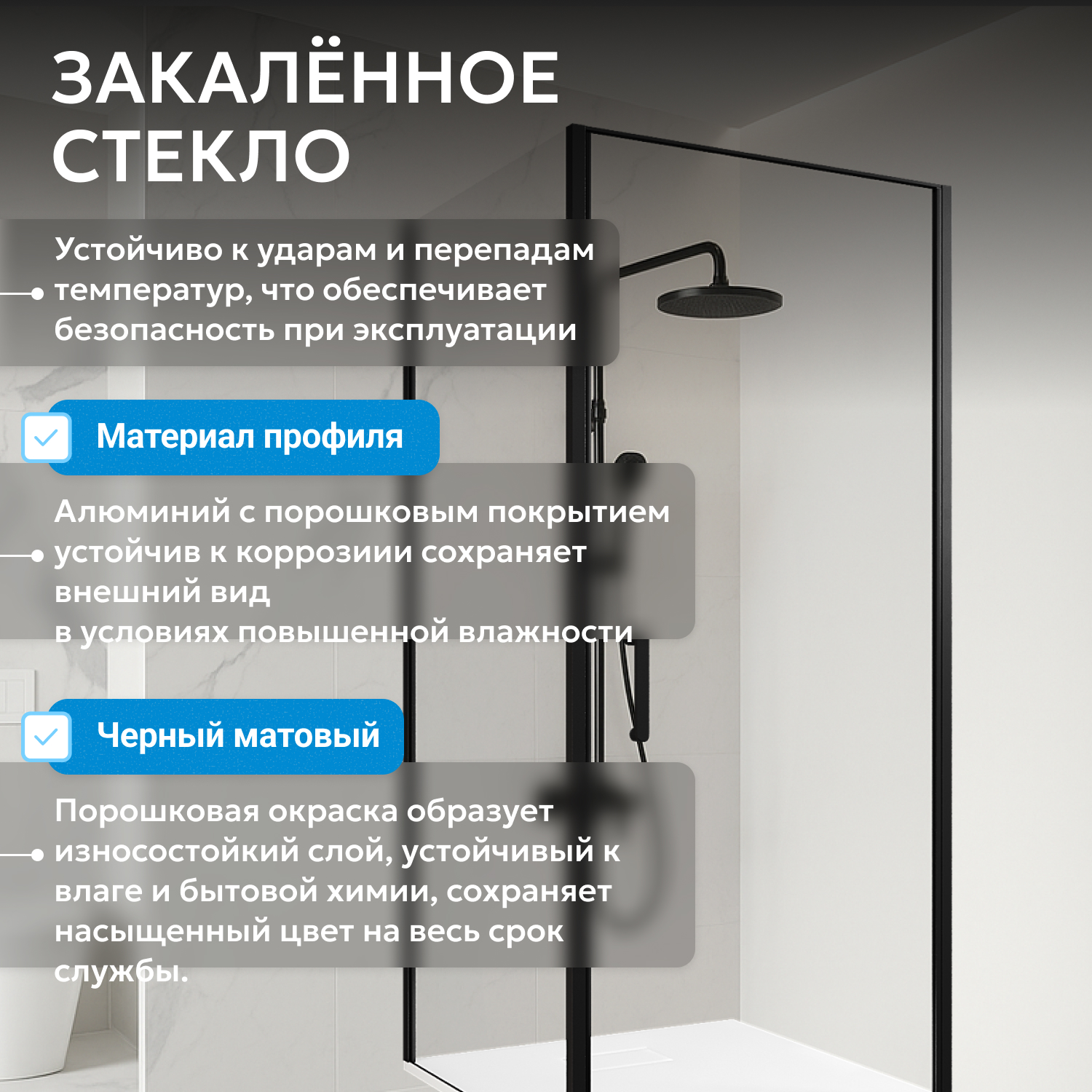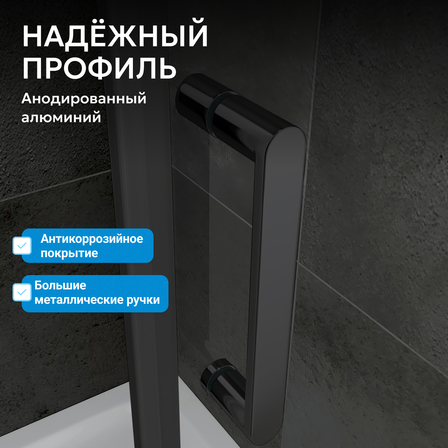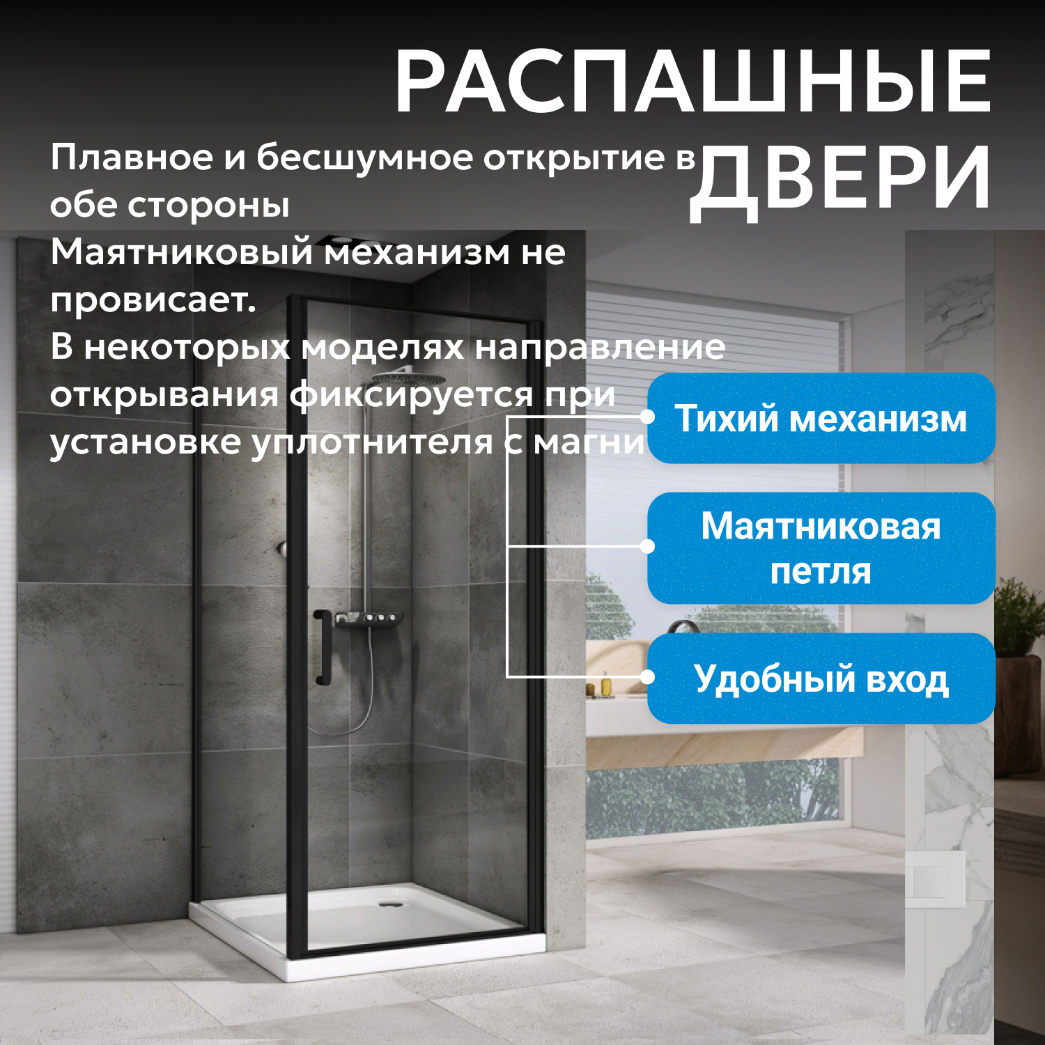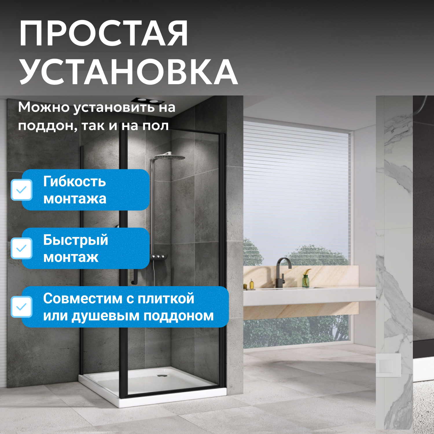 Душевое ограждение Abber Sonnenstrand AG04080B-S75B 800х750х1950 мм, профиль - чёрный, стекло - прозрачное 6 мм. Ширина входа 695 мм, габариты с регулировками: (786-801)х(737-750) мм. Поддон приобретается отдельно.