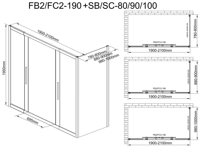 Душевое ограждение Avacan (190-210)х80 см FB2-190-SB80MT, чёрный/матовое