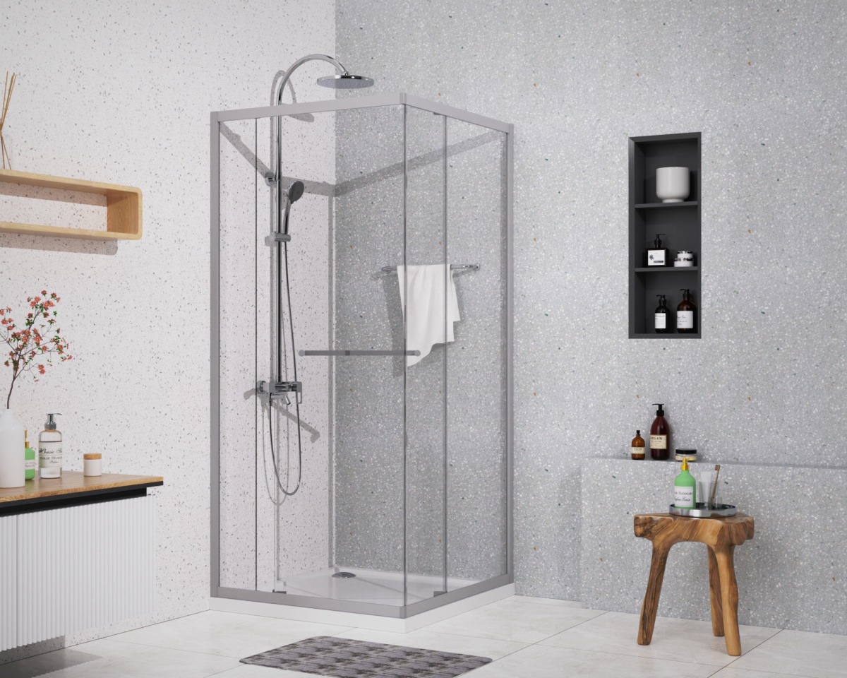 - Квадратный душевой уголок, с одной сдвижной дверью, на специальных усиленных и бесшумных роликах на нержавеющих подшипниках.