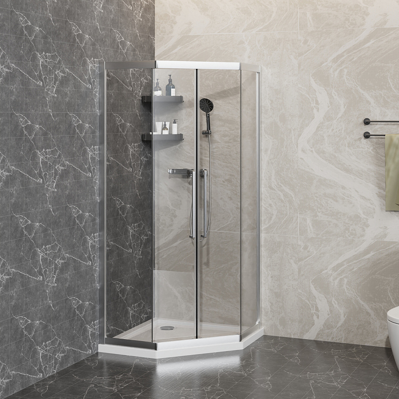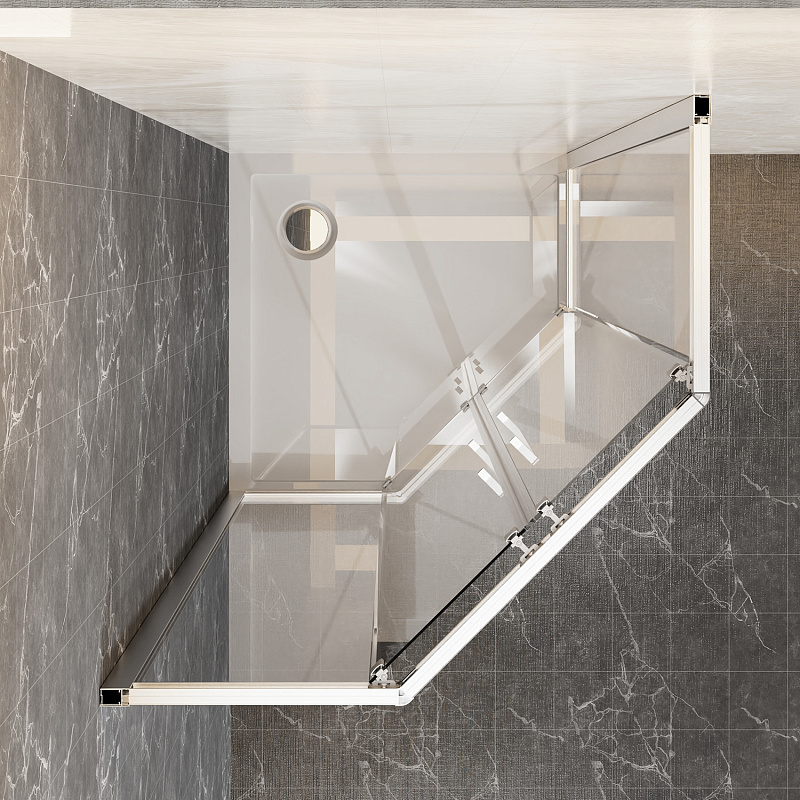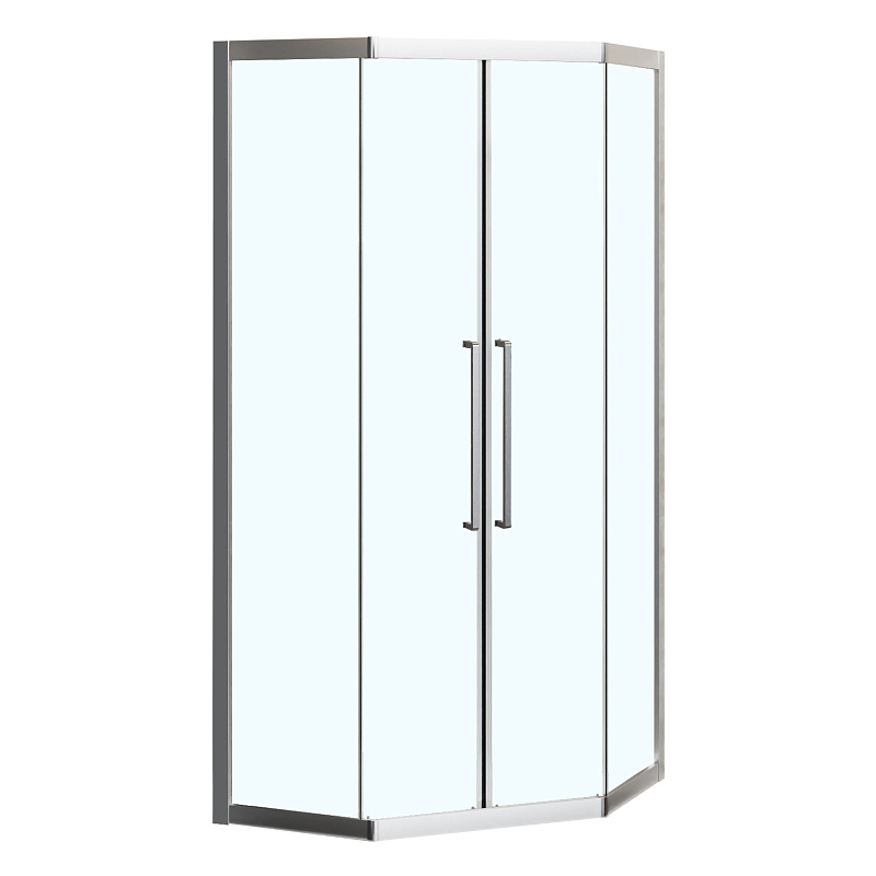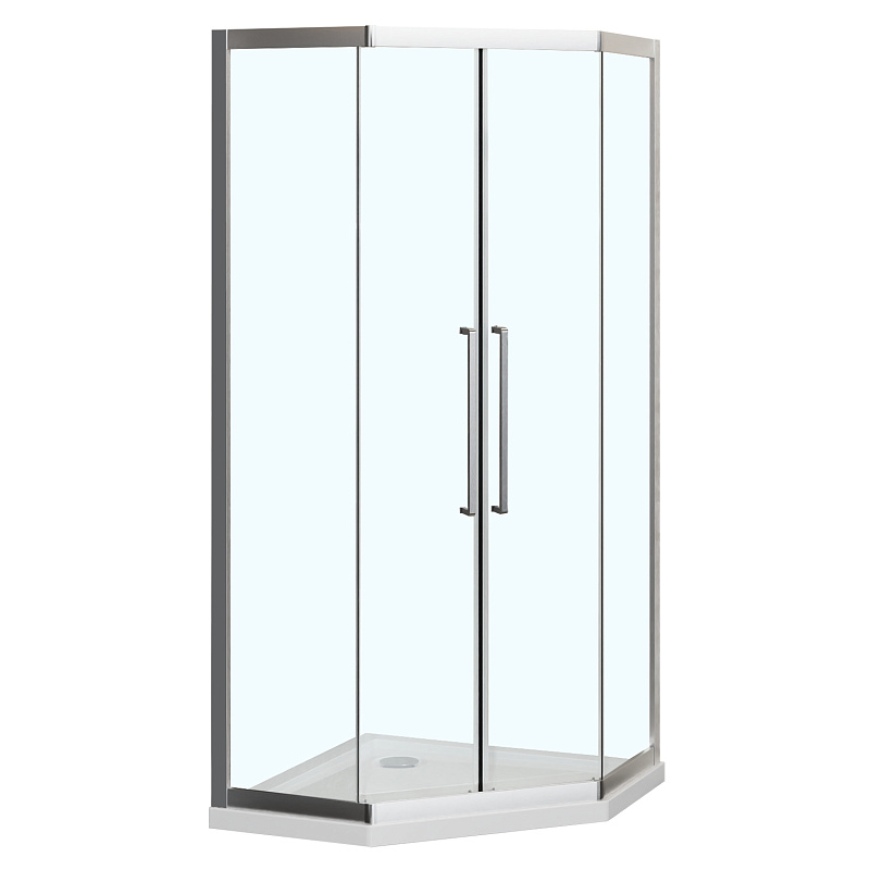 - Пятиугольный душевой уголок, с двумя раздвижными дверьми, на усиленных двойных роликах с нержавеющими подшипниками.