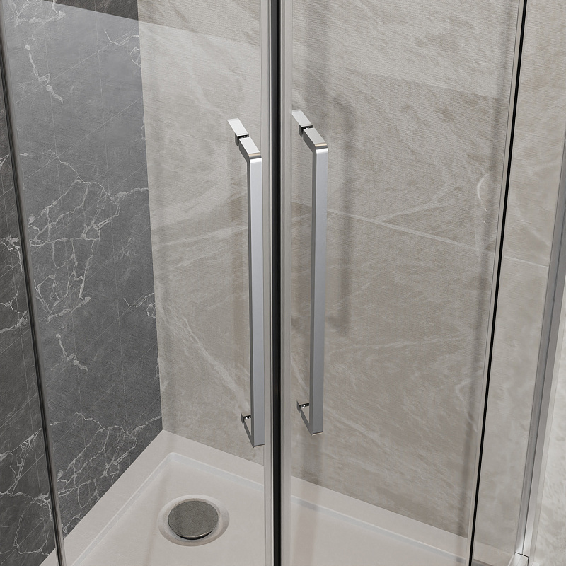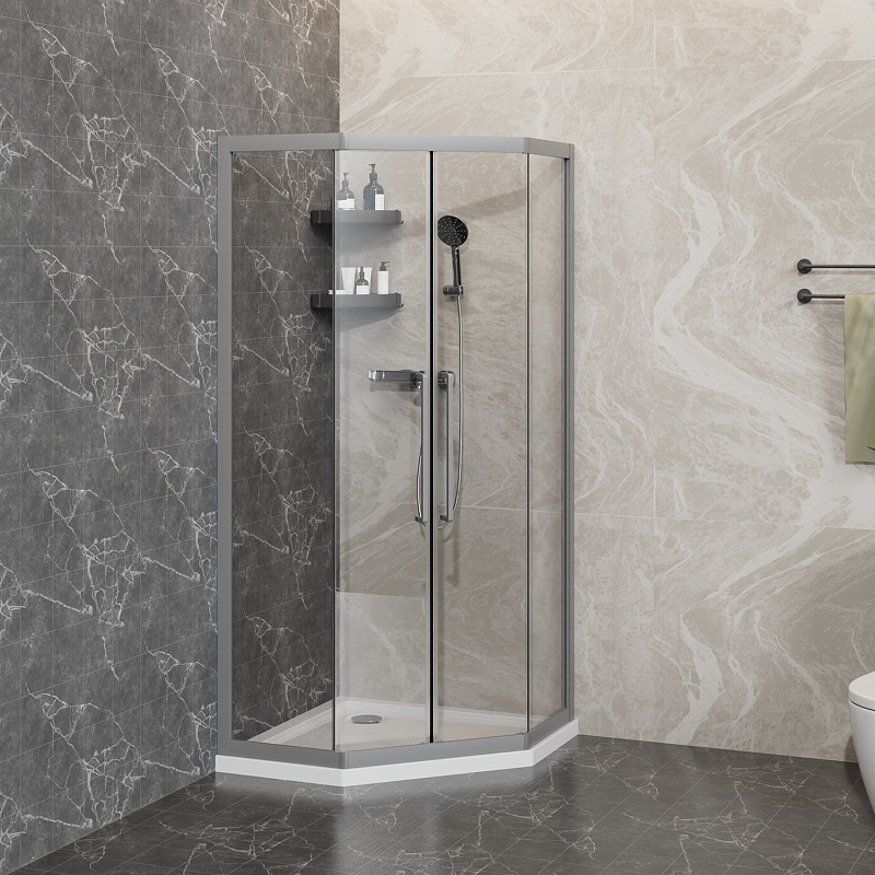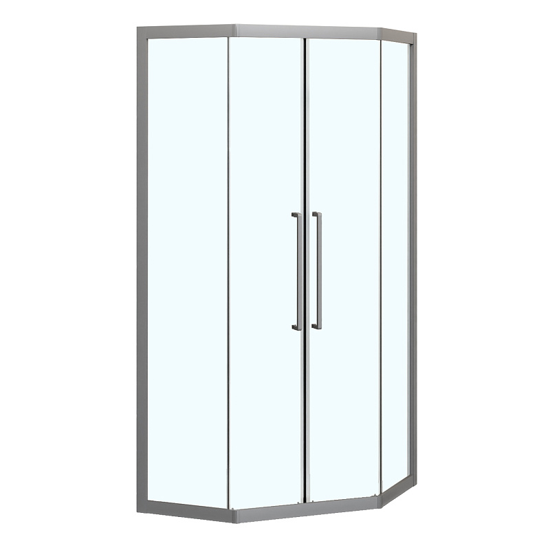 - Пятиугольный душевой уголок, с двумя раздвижными дверьми, на усиленных двойных роликах с нержавеющими подшипниками.