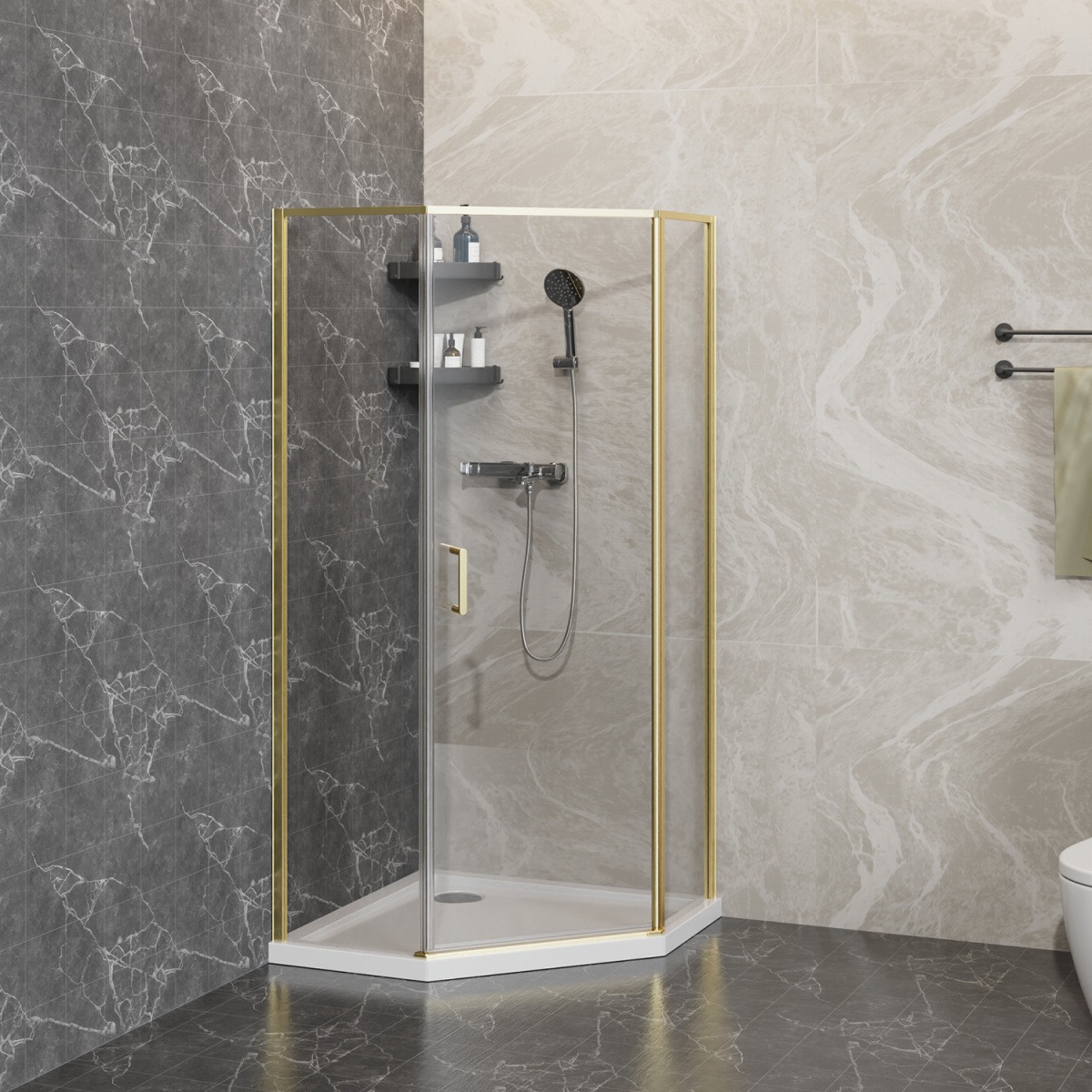 - Пятиугольный душевой уголок, с универсальной распашной дверью (L/R), на усиленном механизме микролифт.