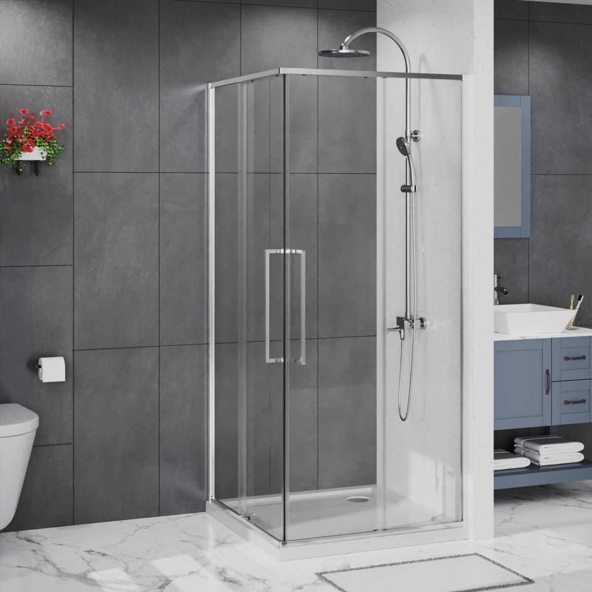 - Душевой Уголок Квадратный, ВХОД С УГЛА, с двумя раздвижными дверьми, на двойных роликах с нержавеющими подшипниками.