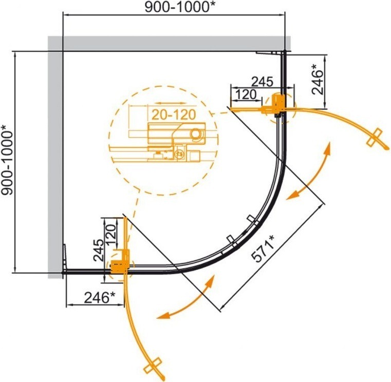 - Конструкция петли позволяет регулировать ширину входа душевого ограждения в диапазоне 10 см