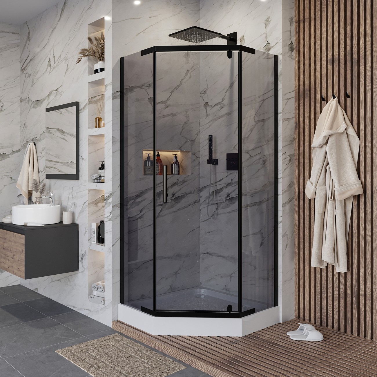 Душевое ограждение Niagara Eco _0101432DT с низким поддоном, размер 995x995x1950 мм, профиль чёрный матовый, стекло тонированное. Ширина входа 520 мм. Низкий поддон и сифон в комплекте.