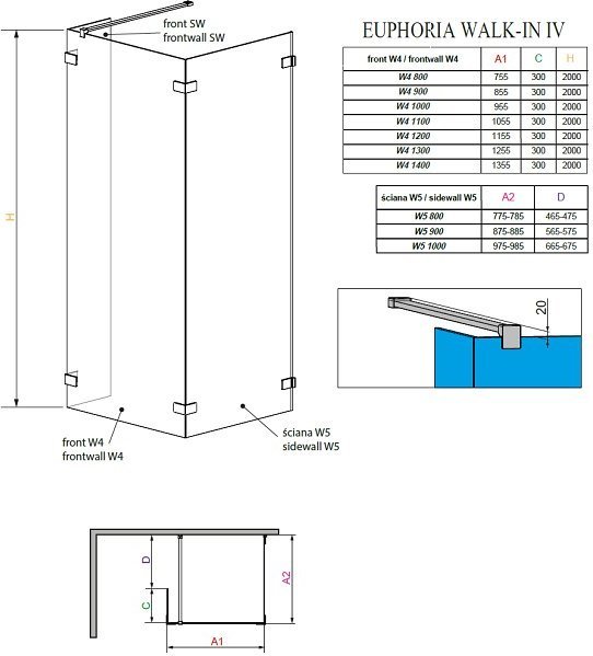 - В комплект входит: фронтальная часть W4 140, боковая стенка W5 100, боковая стенка SW 30, стабилизатор к потолку 8 мм.